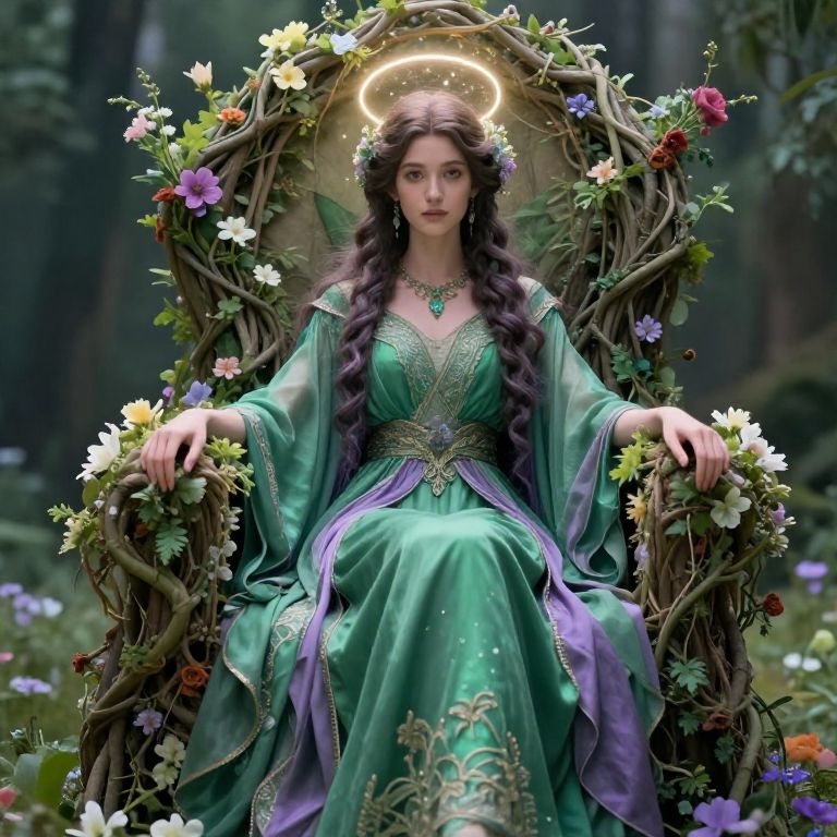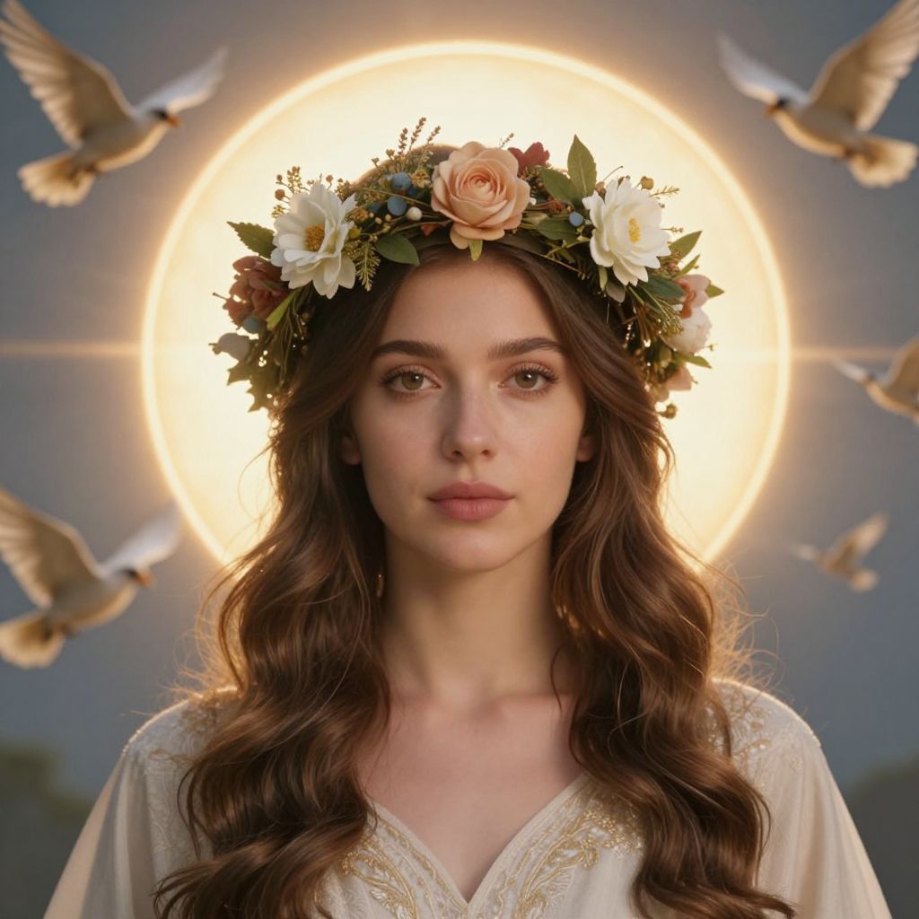 The image depicts a serene scene of three Greek sisters, each adorned with a delicate gold halo and floral crowns, set against the backdrop of a fantastical garden with towering columns and intricate floral designs. The central figure, a woman with a serene expression, is flanked by two younger sisters, their faces illuminated by a soft, ethereal light. The garden is bathed in a warm, golden glow, creating a dreamlike atmosphere. The composition is balanced, with the sisters positioned symmetrically, their gazes directed towards the viewer, creating a sense of connection and harmony. The overall scene is rich in detail, with intricate textures and a harmonious color palette that evokes a sense of timeless beauty and tranquility. The use of fairy lights and soft yellow light enhances the ethereal quality of the image, while the intricate high details and photo-realism add depth and realism to the scene. The image is a testament to the skillful use of the Unreal Engine and the intricate artistry of Anna Dittmann, showcasing the power of digital art to create breathtaking visual experiences.