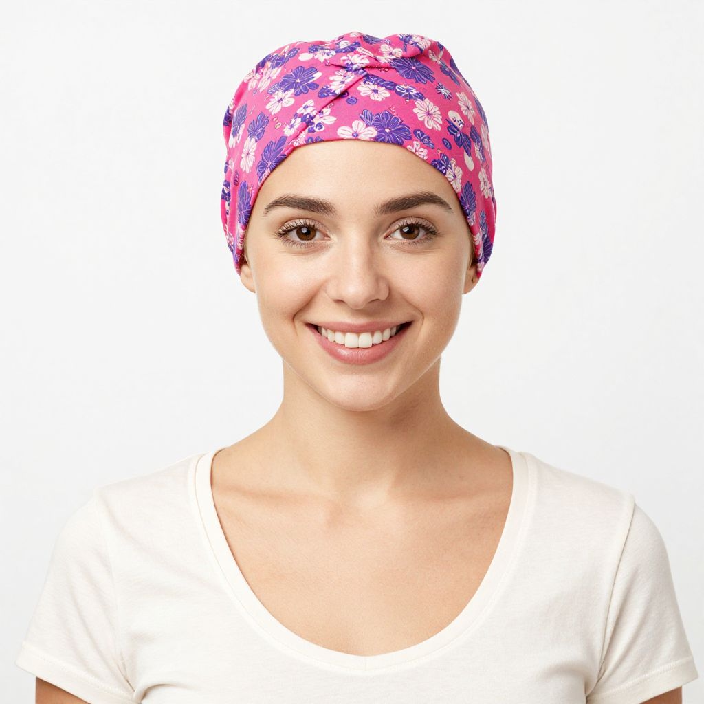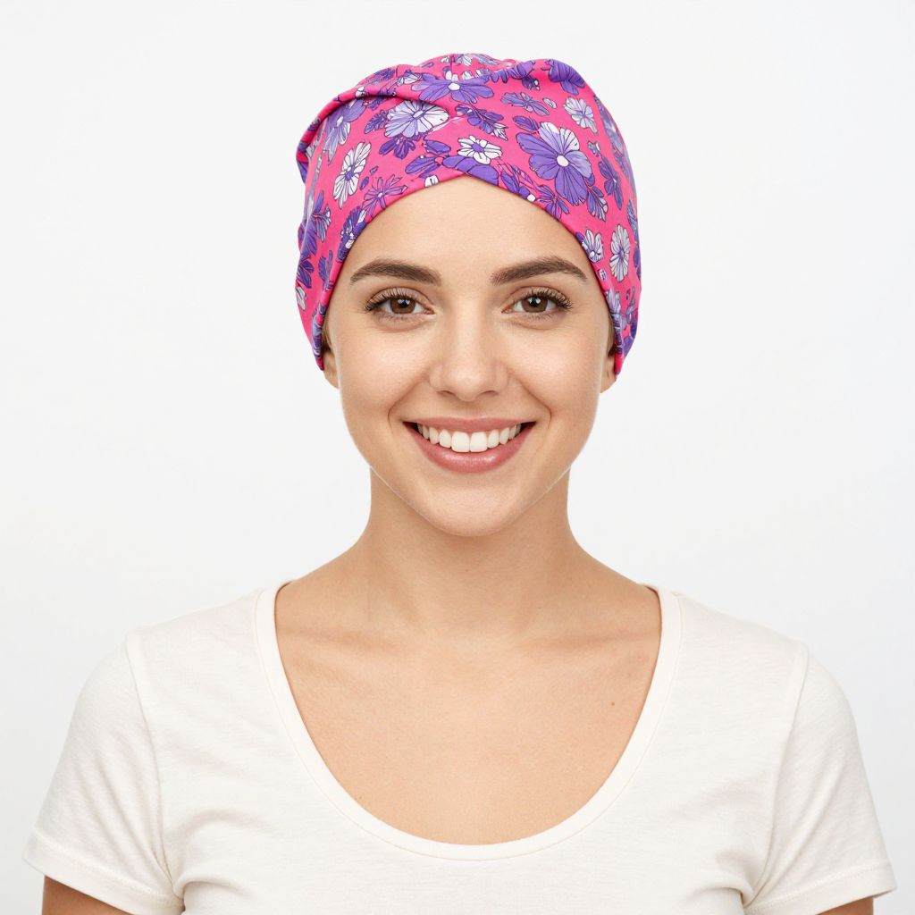 Smiling woman wearing a vibrant pink and purple floral-patterned chemo hat turban paired with a cream-colored scoop-neck T-shirt against a plain white background.