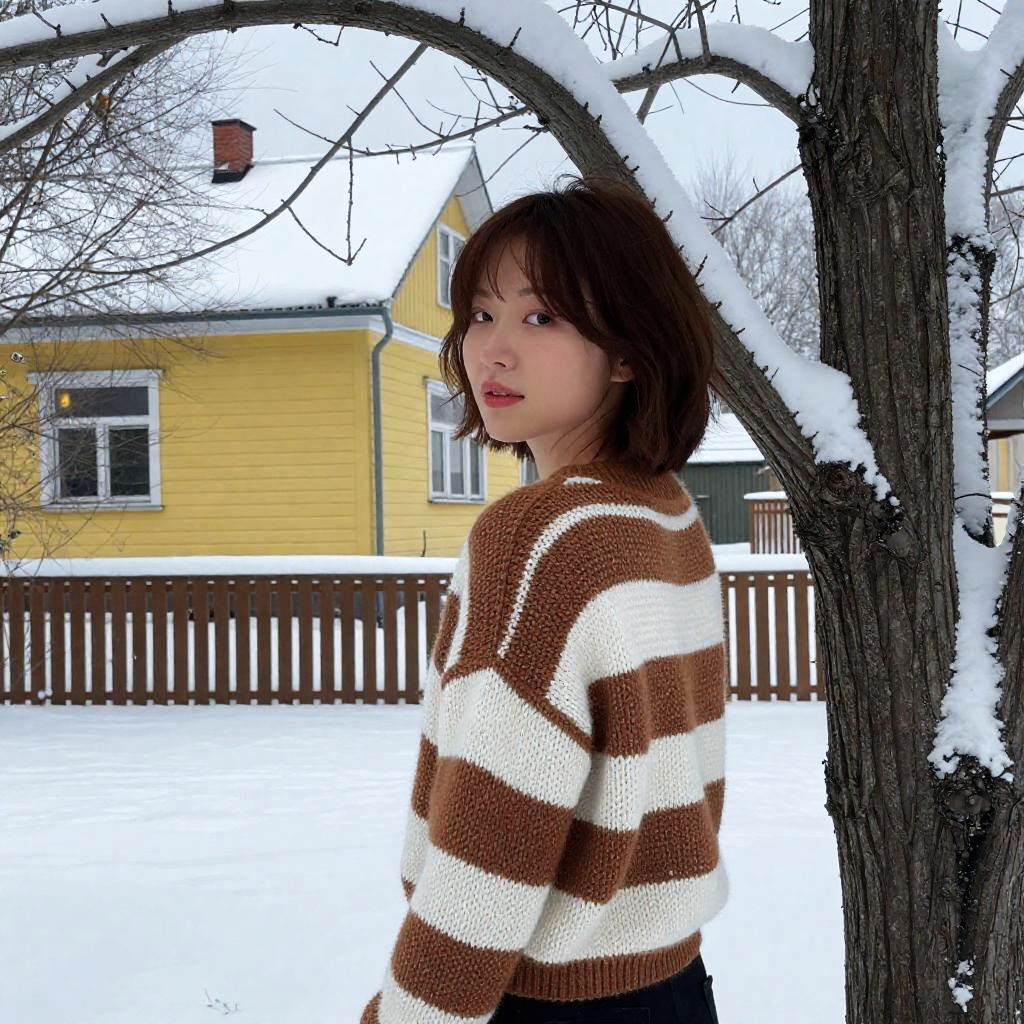 A young woman with short brown hair wearing a crocheted brown and white striped sweater stands behind a snow-covered tree, looking over her shoulder. The background shows a yellow wooden house with a white roof, bare trees without leaves, and a snow-covered ground, creating a winter outdoor scene.