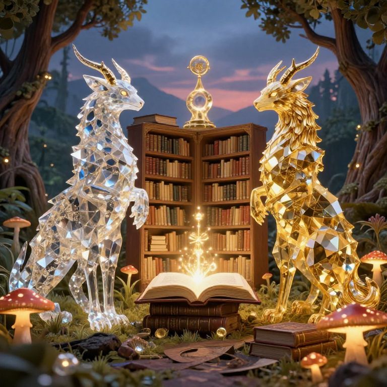Fantasy scene: two illuminated, glittering unicorn-like statues flank a glowing book, with a library backdrop, mushrooms, and a twilight forest.