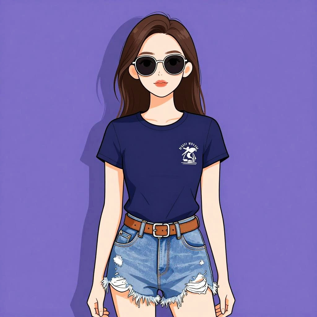 Digital drawing of a young woman with long brown hair, wearing round black sunglasses, a navy blue t-shirt with a small white logo on the left chest, and frayed, blue denim shorts with white rips. She has a slender build and fair skin, standing against a solid purple background. The style is vibrant and cartoon-like, with bold colors and clean lines. She wears a brown belt with a rectangular buckle, and her hands rest by her sides. The overall aesthetic is casual and modern.
