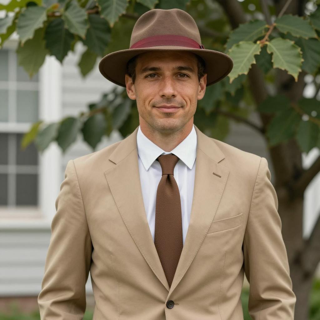 Man with light brown skin, short brown hair, wearing a tan suit, white shirt, and brown tie, and a brown fedora with a red band. Standing in front of a green leafy tree and a white house with a window. He has a slight smile and relaxed posture. Natural light.