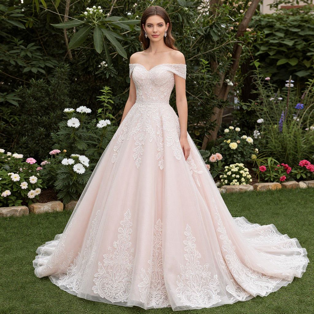 Elegant off-the-shoulder princess-style wedding dress in soft pink, featuring intricate lace detailing and a flowing tulle skirt, gracefully draped against a backdrop of lush greenery and blooming flowers.
