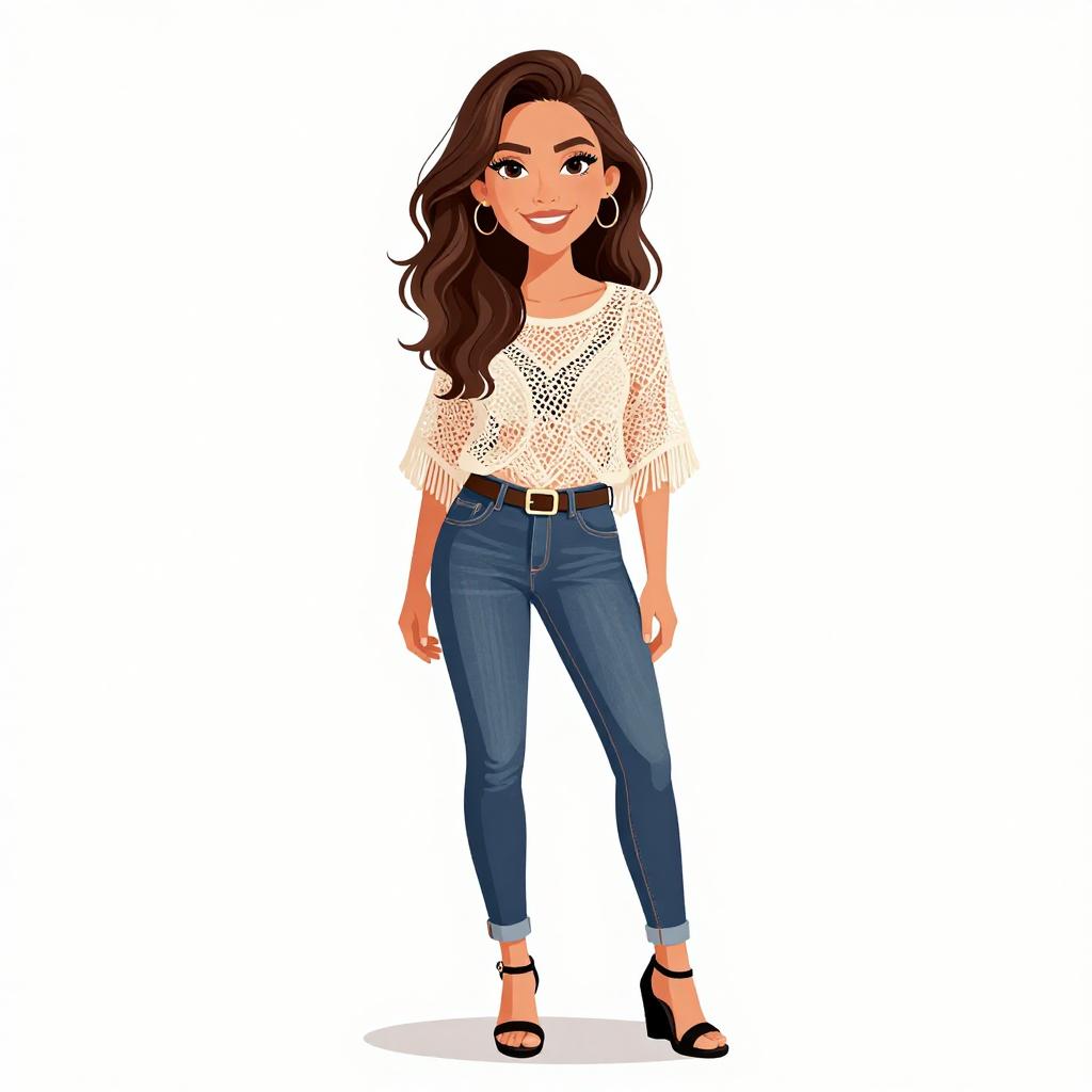 Woman with pretty face and pretty hair. smiling Woman, casual chic, cropped cream turtleneck sweater, long sleeves, high-waisted dark blue skinny jeans, transparent high-heeled sandals, white background. --sref 1467