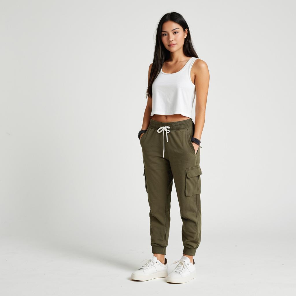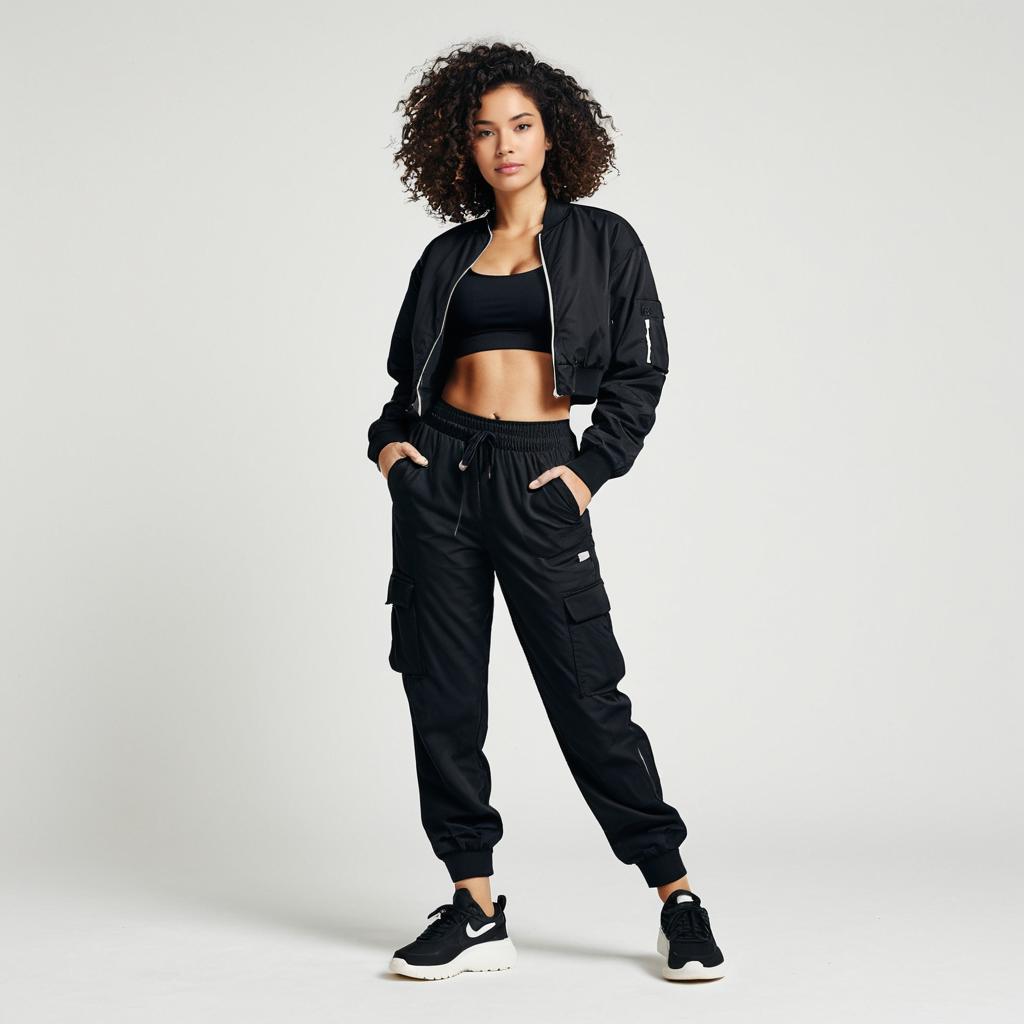 Woman, casual sporty, black cropped bomber jacket, matching high-waisted jogger pants with cargo pockets, black sports bra, black sneakers with white soles, natural curly hairstyle, plain white studio background.