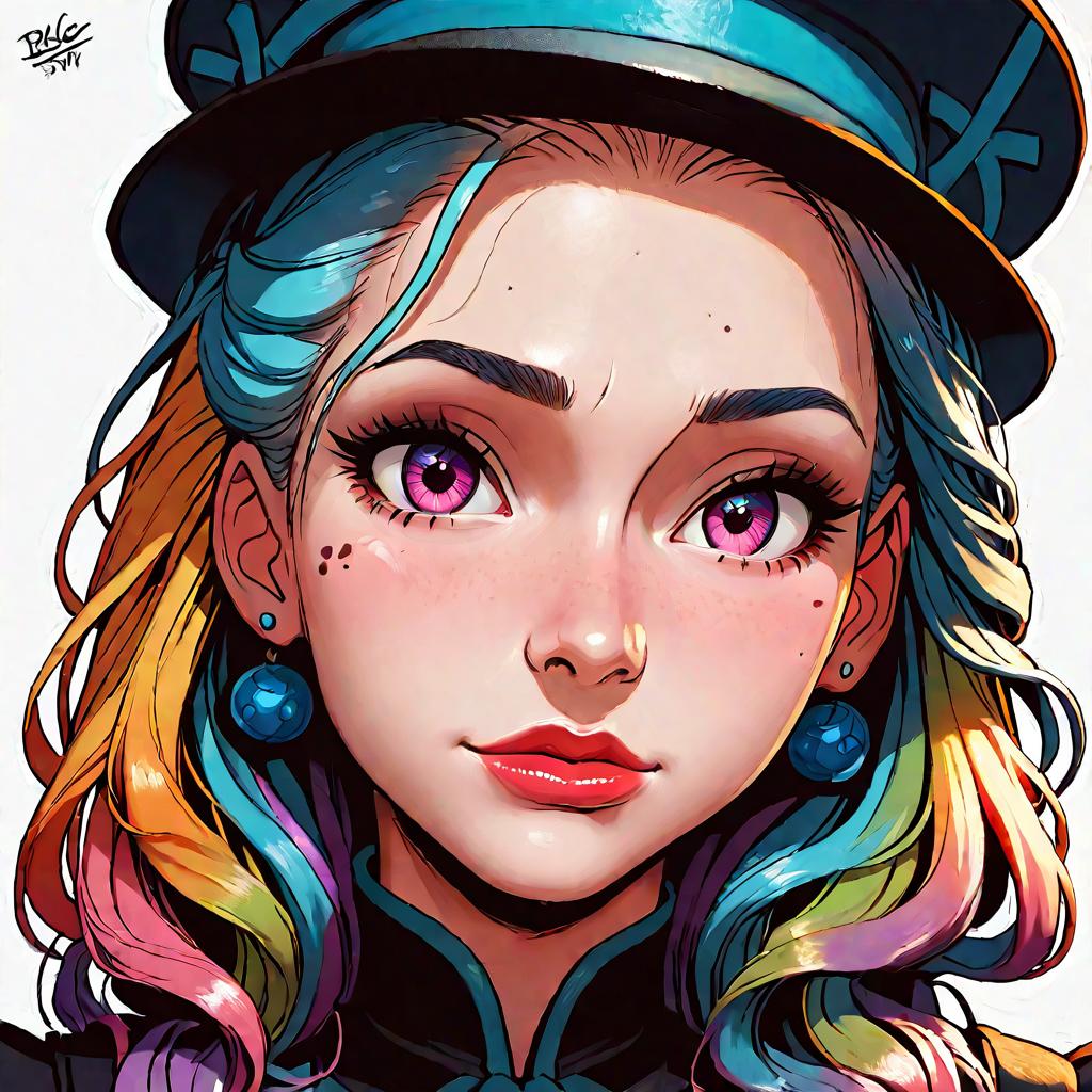 A detailed, high-resolution digital illustration of a young woman in pop art style. She has vibrant multi-colored hair in shades of pink, blue, yellow, and orange, striking pink eyes, and a soft expression. The subject wears a teal and black hat with matching earrings and a dark outfit with teal accents. The artwork features sharp lines, vivid colors, and a masterpiece-quality finish.