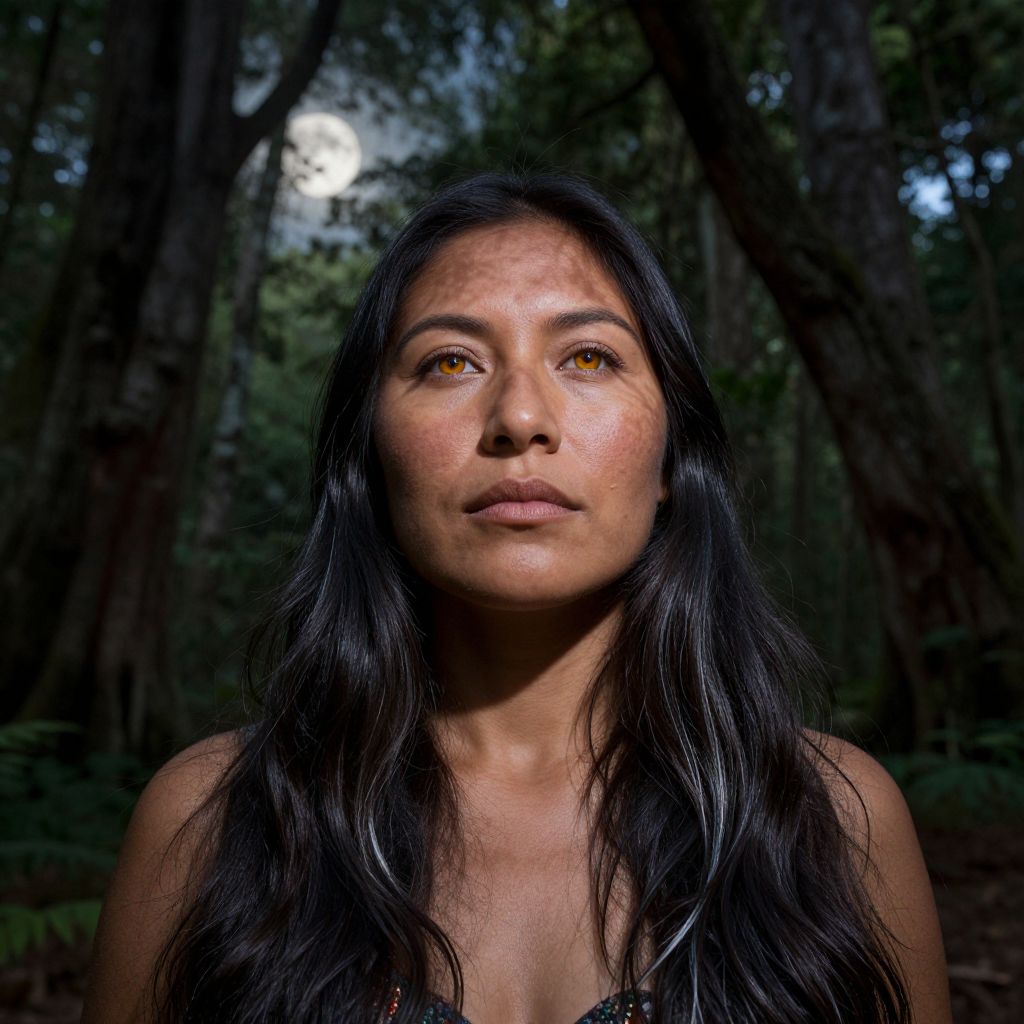 Imagine a portrait photograph capturing an indigenous American woman with striking amber eyes and porcelain skin, illuminated by soft moonlight filtering through ancient tree canopies. From a low-angle perspective, she stands tall and regal amidst the dense forest, her dark hair cascading in gentle waves to her waist, revealing subtle silvery streaks that hint at untold wisdom and a life intertwined with nature's mysteries. Ethereal lighting casts intricate shadows across her face, accentuating fine lines that narrate stories of resilience and serenity, as her introspective gaze invites viewers to delve into the depths of her soul. This harmonious blend of realism and mystique captures the essence of ancient beauty.