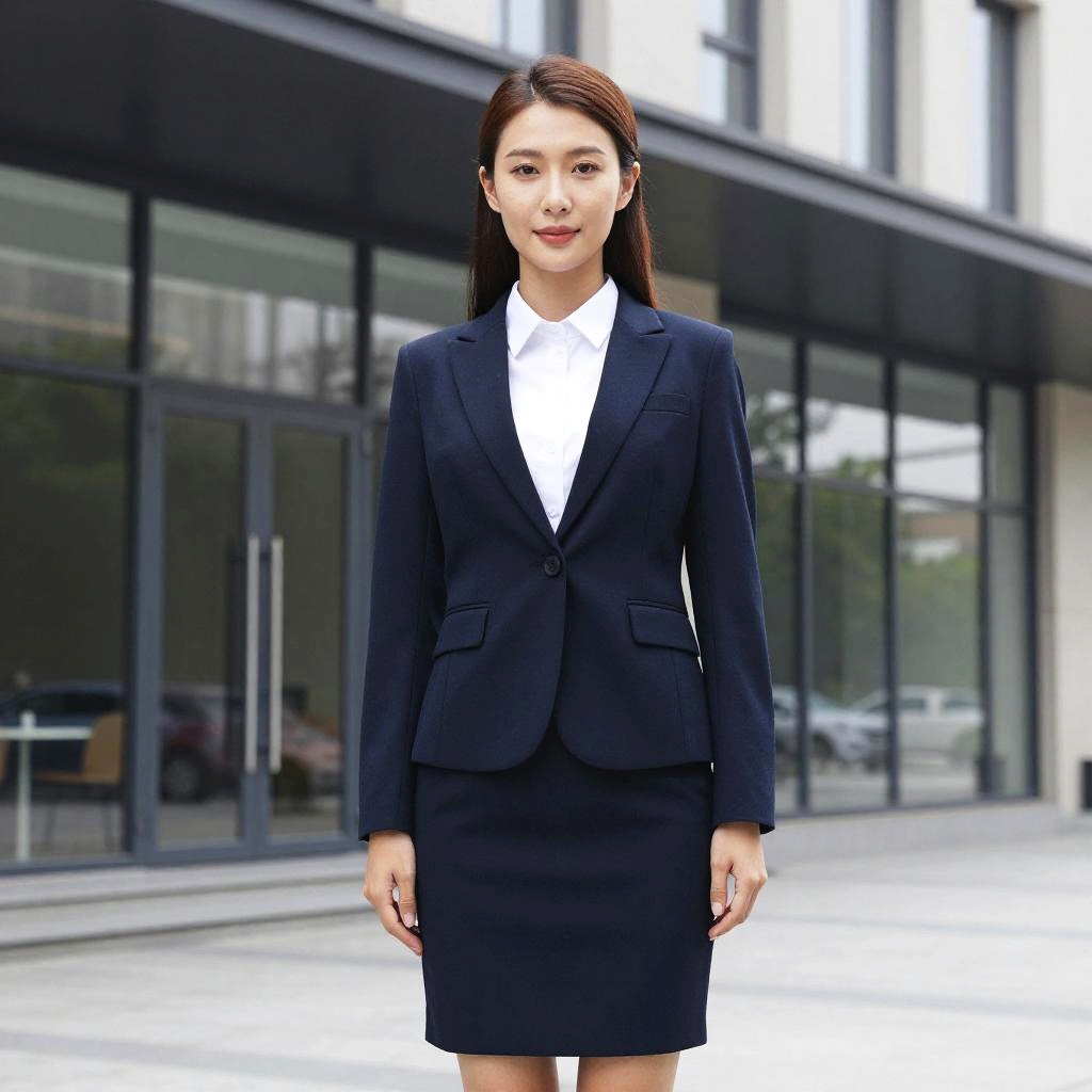 Photograph of an Asian woman standing outdoors in front of a modern, white, and gray building with large windows. She has shoulder-length, dark brown hair and is wearing a dark navy blue, tailored, single-breasted blazer with a white dress shirt underneath, paired with a matching dark navy blue skirt that reaches just above her knees. Her expression is neutral, and she stands with her hands by her sides. The background is slightly blurred, emphasizing her as the focal point of the image. The lighting is natural, highlighting her professional attire.