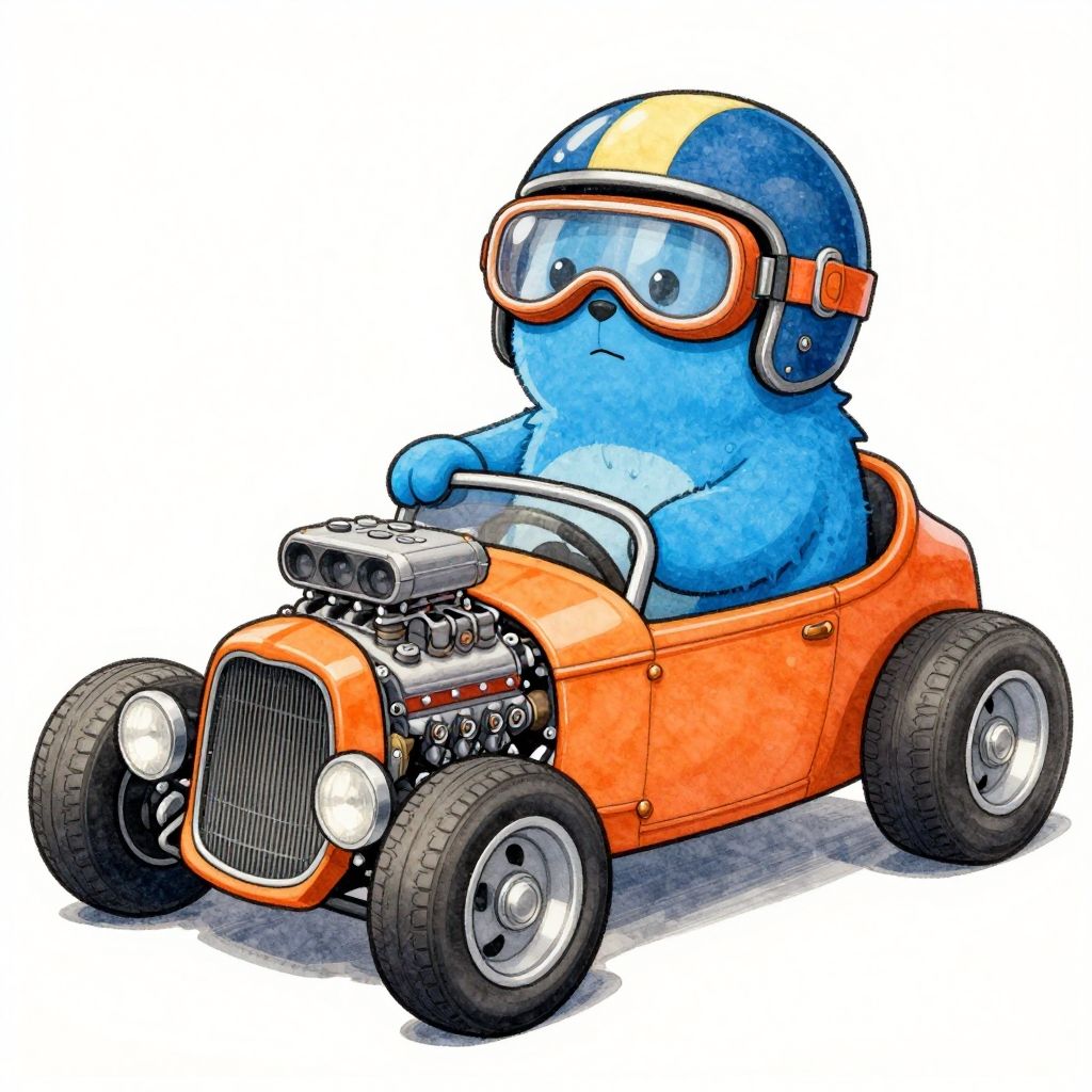 Colorful illustration of a cute and funny blue yeti wearing a helmet and orange goggles, driving an orange hotrod with an oversized engine. The artwork is inspired by ratfink style by Ed Roth, featuring a whimsical and cartoonish design with detailed watercolor and pen work.