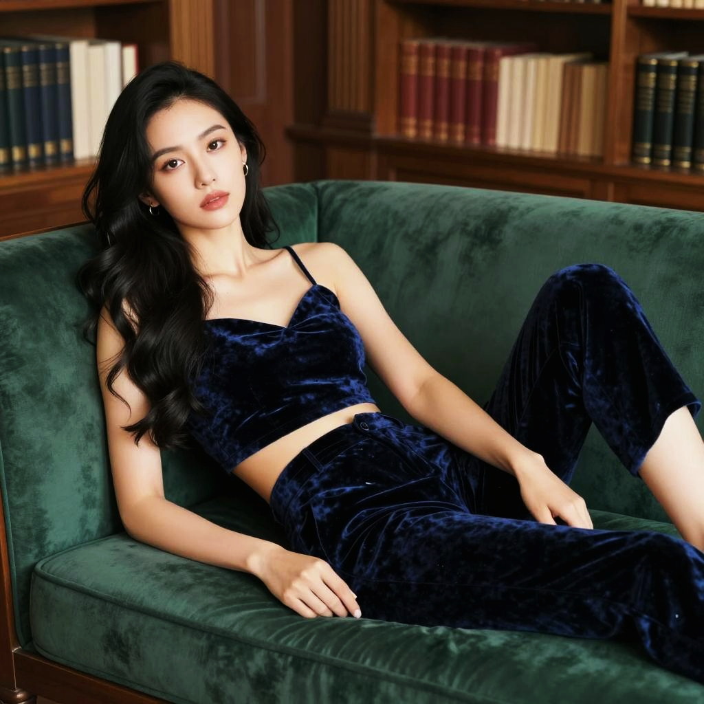 Young Asian woman with long wavy black hair reclining on a green velvet sofa in a luxurious library. She wears a midnight blue velvet crop top and matching pants, showcasing a sophisticated and relaxed style. The background features wooden bookshelves filled with books, enhancing the elegant atmosphere.