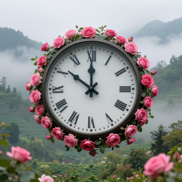 Photograph of a round clock with pink roses surrounding it, set against a misty, green mountainous background. Black Roman numerals, black hands