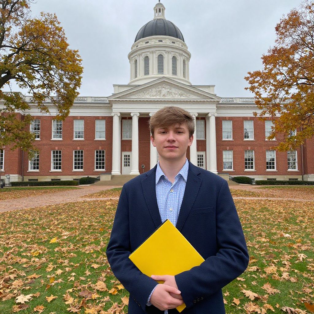 Photograph of a young man with light brown hair, wearing a dark blue blazer over a light blue checkered shirt, holding a yellow folder. He stands in front of a grand, neoclassical brick building with white columns and a dome, surrounded by fallen autumn leaves on a grassy lawn. The sky is overcast. Trees with orange and yellow leaves frame the background.