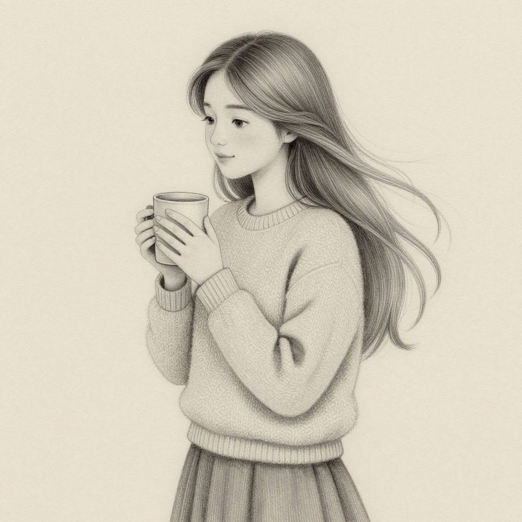 A delicate pencil illustration depicts a serene young woman with long, flowing hair, dressed in a cozy sweater and skirt, holding a warm mug, exuding a calm and inviting atmosphere.