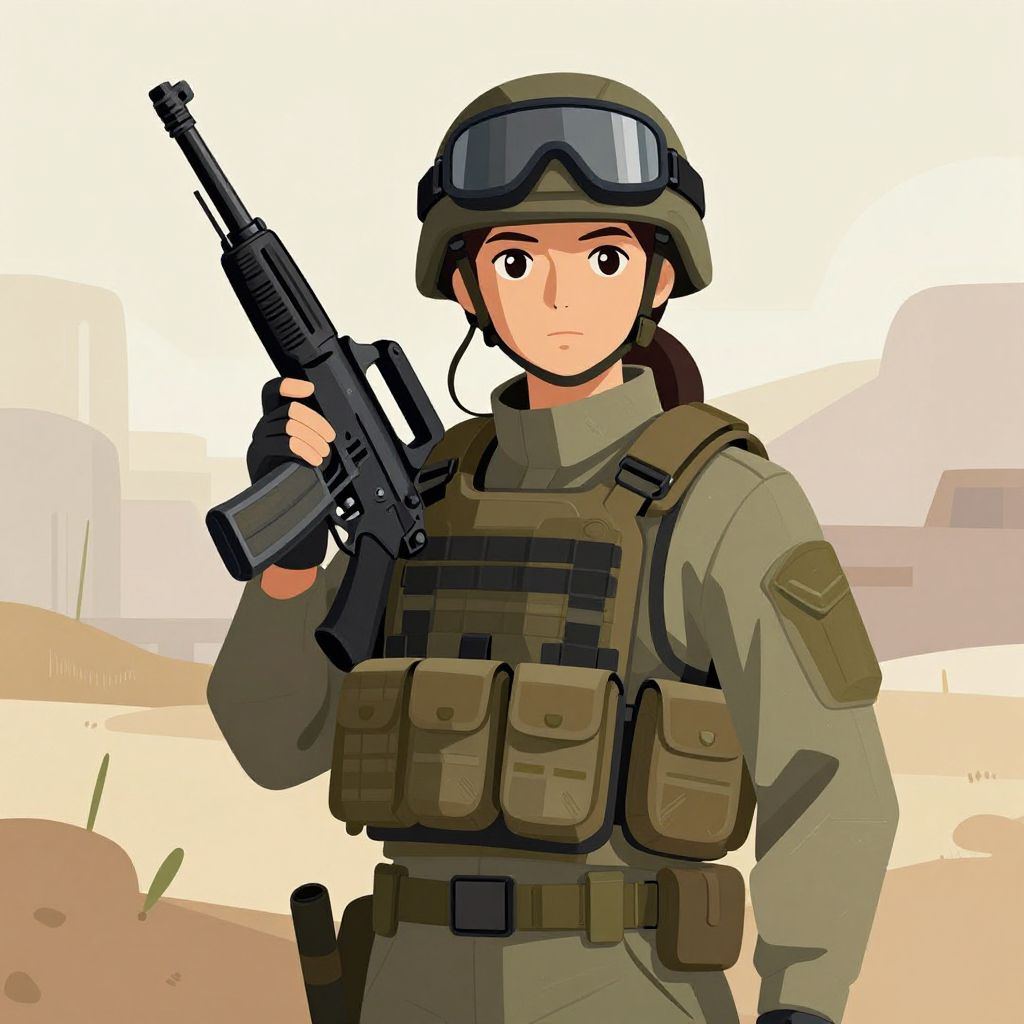The image depicts a soldier, specifically a woman, in a detailed and stylized vector painting reminiscent of the works of Makoto Shinkai, Craig Mullins, and Joe Madureira. The muted color palette consists of earthy tones, with shades of beige, brown, and muted greens dominating the scene. The woman is dressed in a military uniform, complete with a tactical vest adorned with various pouches and straps, and a helmet with goggles. She holds a rifle, which is positioned to the left side of the image, with the barrel pointing diagonally upwards. The background is abstract, featuring soft, blurred shapes that suggest a desert or arid environment, with subtle hints of a cityscape in the distance. The overall composition is balanced, with the soldier centrally positioned, and the rifle adding a dynamic element to the scene. The interplay of colors and textures creates a sense of depth and realism, despite the vector art style.