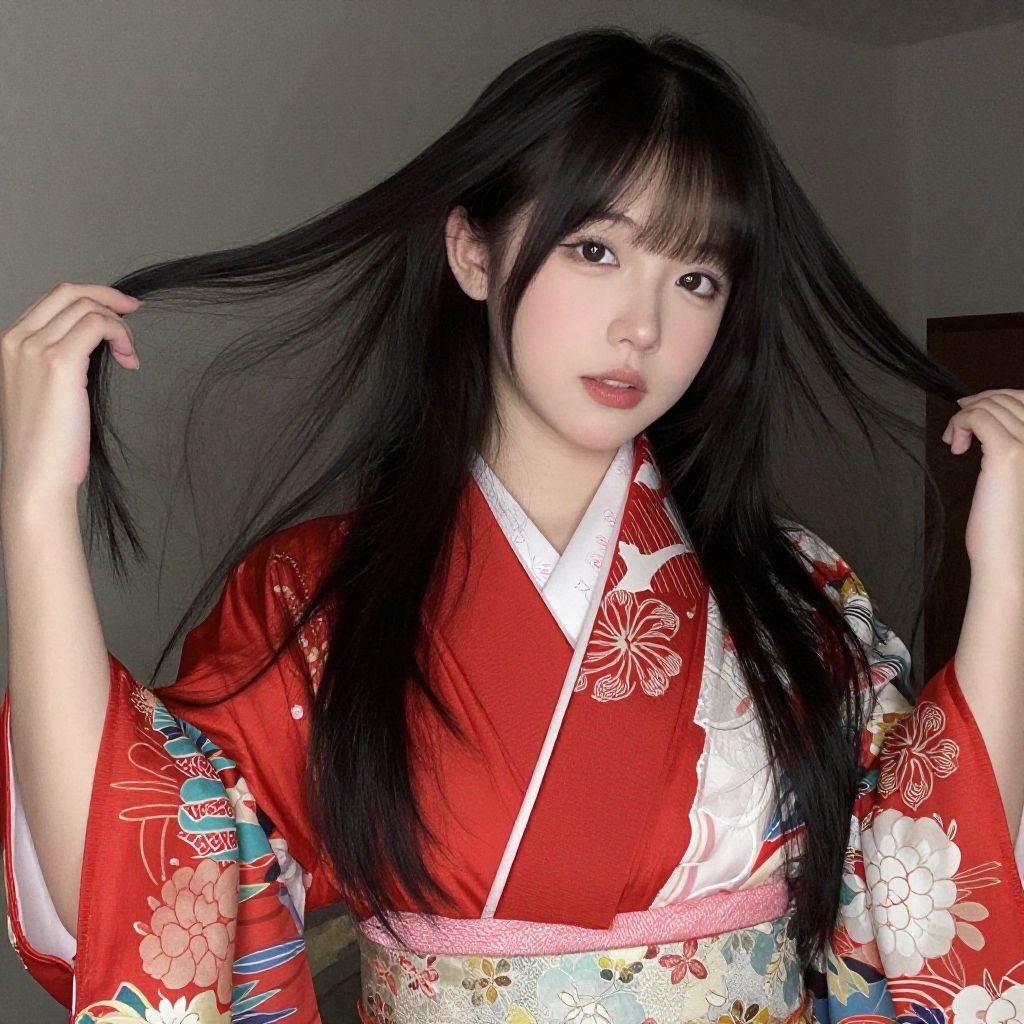 A detailed portrait of a young woman with long black hair wearing a richly patterned red and white kimono. She has delicate feminine facial features and is playfully twirling her hair with one hand. The image features soft lighting and texture-rich fabric, highlighting the intricate designs on her garment.
