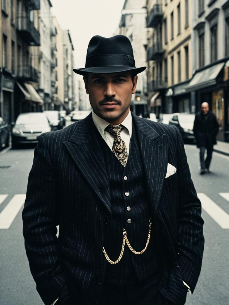 Man in Gangster Costume, photorealistic outdoor portrait in city street