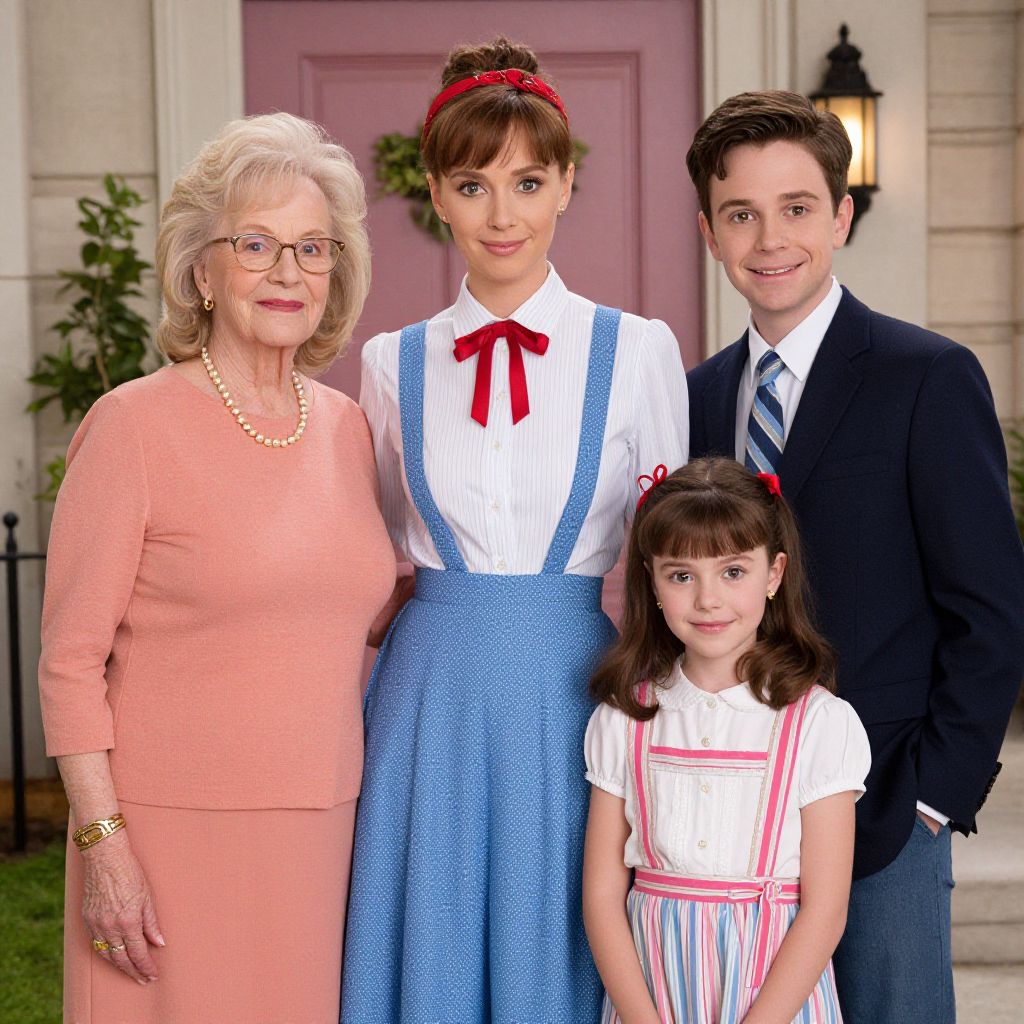 Photograph of a family of four standing in front of a brick building with a blue door. On the left, an elderly white woman with short white hair wears a black jacket and necklace. Center, a young white woman with brown hair in an updo, red headband, and pink coat with red accents. To her right, a young white girl with long brown hair, wearing a black skirt and white blouse with a black ribbon. On the far right, a young white man with short brown hair, wearing a black suit and white shirt. They all smile at the camera.