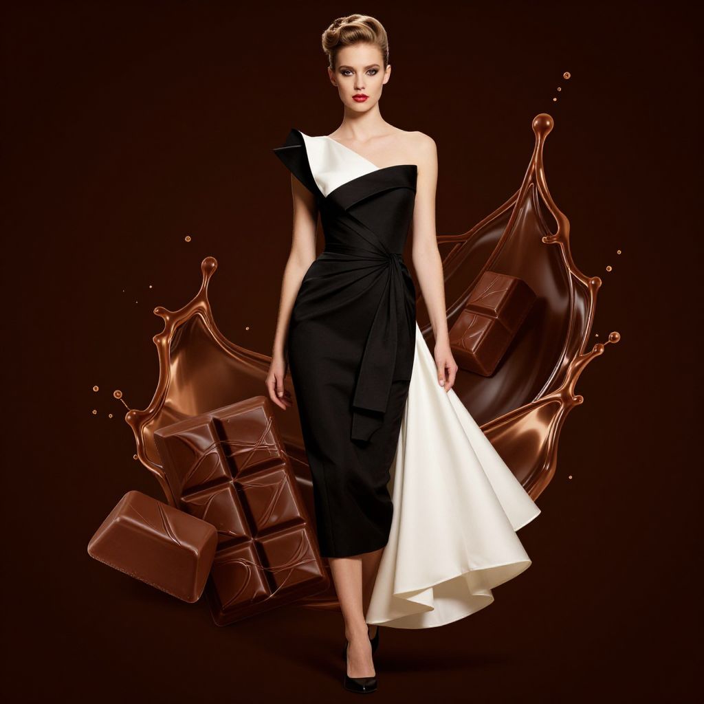 Chocolates beauty fashion art , Clean splash art for a fashion model wearing a Schiaparelli dress - Remix by,
