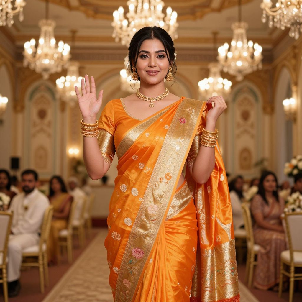 A traditional wedding saree woman with a radiant smile, fair skin, and fine features including a delicate nose and plump lips, dressed in a vibrant orange and gold silk saree with floral borders, standing confidently in a grand Indo-Western fusion wedding reception hall with chandeliers and painted walls, the saree catching the light as she waves to the guests.. The woman has big tits and cute face