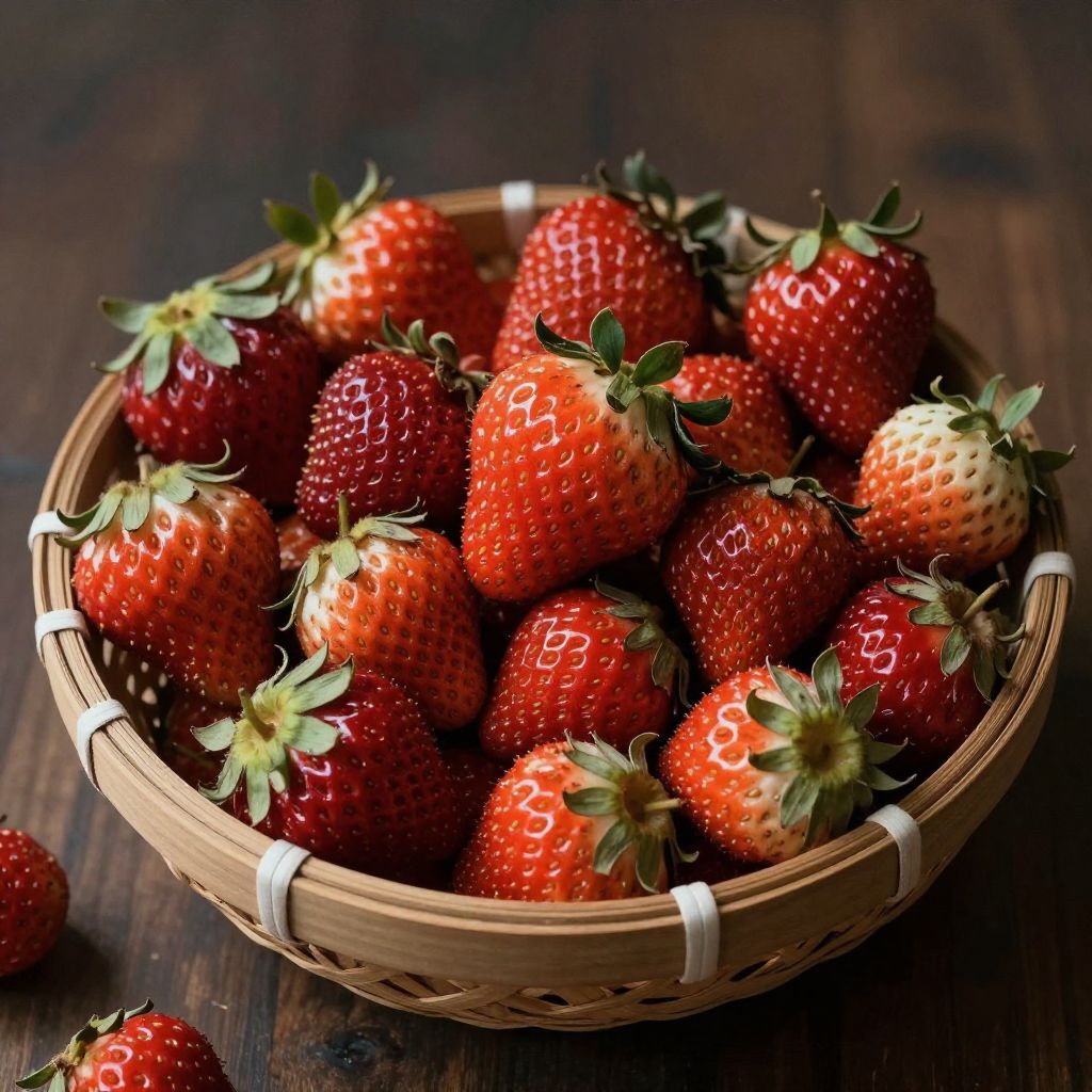 Flowberrys harvested in a rustic wooden basket, placed on an old wooden table with scattered leaves, warm autumn colors, painterly style with impressionist brush strokes, cozy countryside atmosphere with sun rays highlighting the fruits.