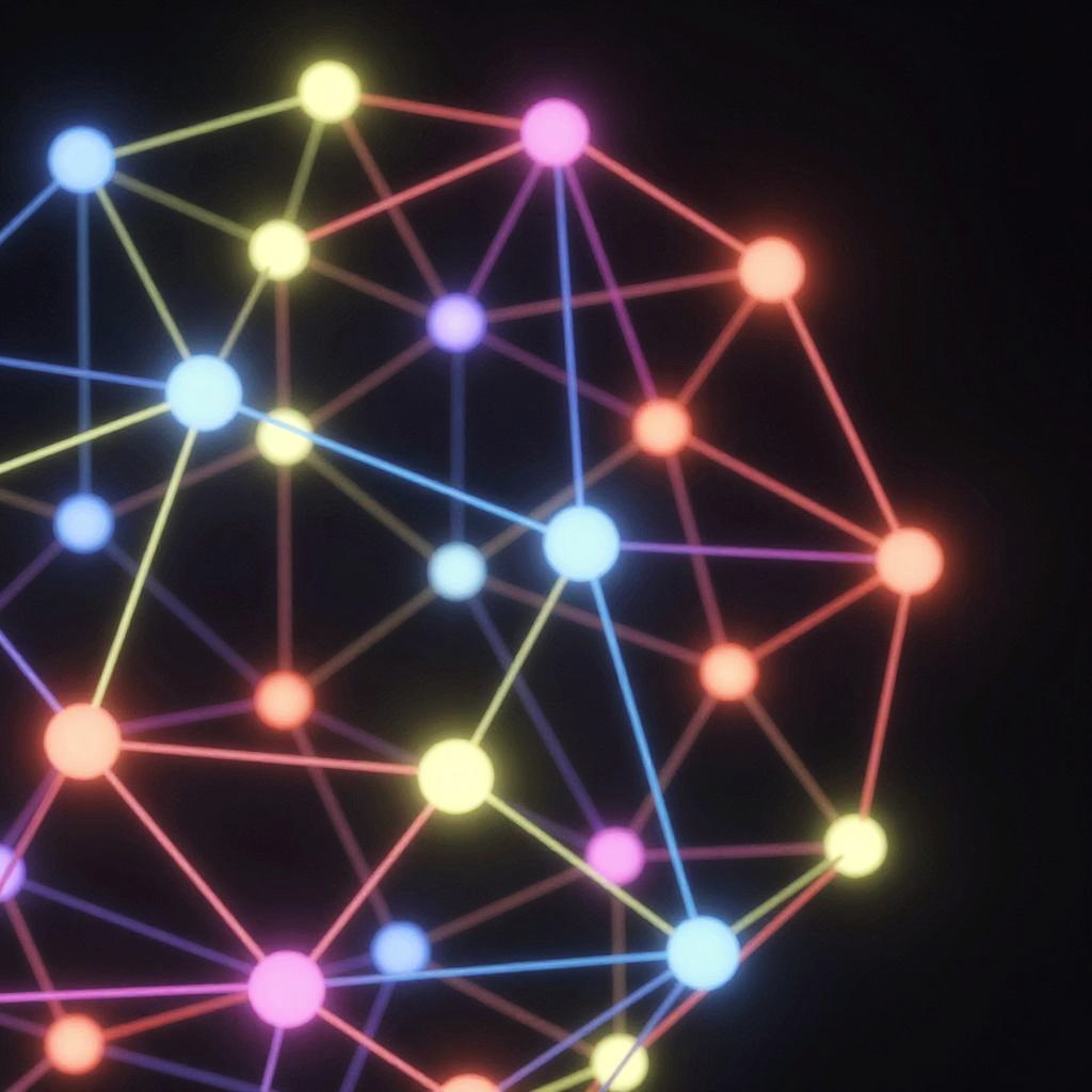 Interconnected nodes as part of an abstract geometric structure, composed of glowing spheres and glowing lines in vibrant hues, showcasing network connectivity and modern technology aesthetics
