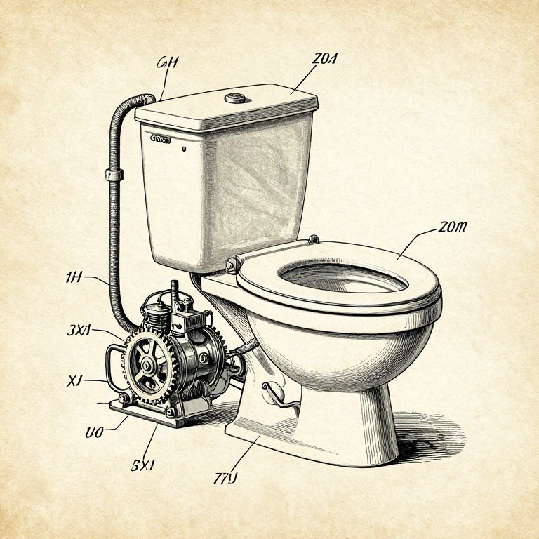 The image is a detailed patent illustration of a side view of a toilet with an intricate mechanical engine. The toilet bowl is centrally positioned, with a lid and seat attached. To the left of the toilet, there is a complex mechanical engine consisting of various components, including a clockwork mechanism, gears, and wires. The engine is connected to the toilet by several pipes and hoses, indicating a functional relationship between the two. The illustration is annotated with numerous labels, each corresponding to specific parts of the toilet and the mechanical engine, providing a comprehensive breakdown of the design. The background is a textured, aged paper, giving the image an antique appearance. The overall composition is well-organized, with the toilet and mechanical engine clearly delineated and the labels neatly placed to enhance understanding.