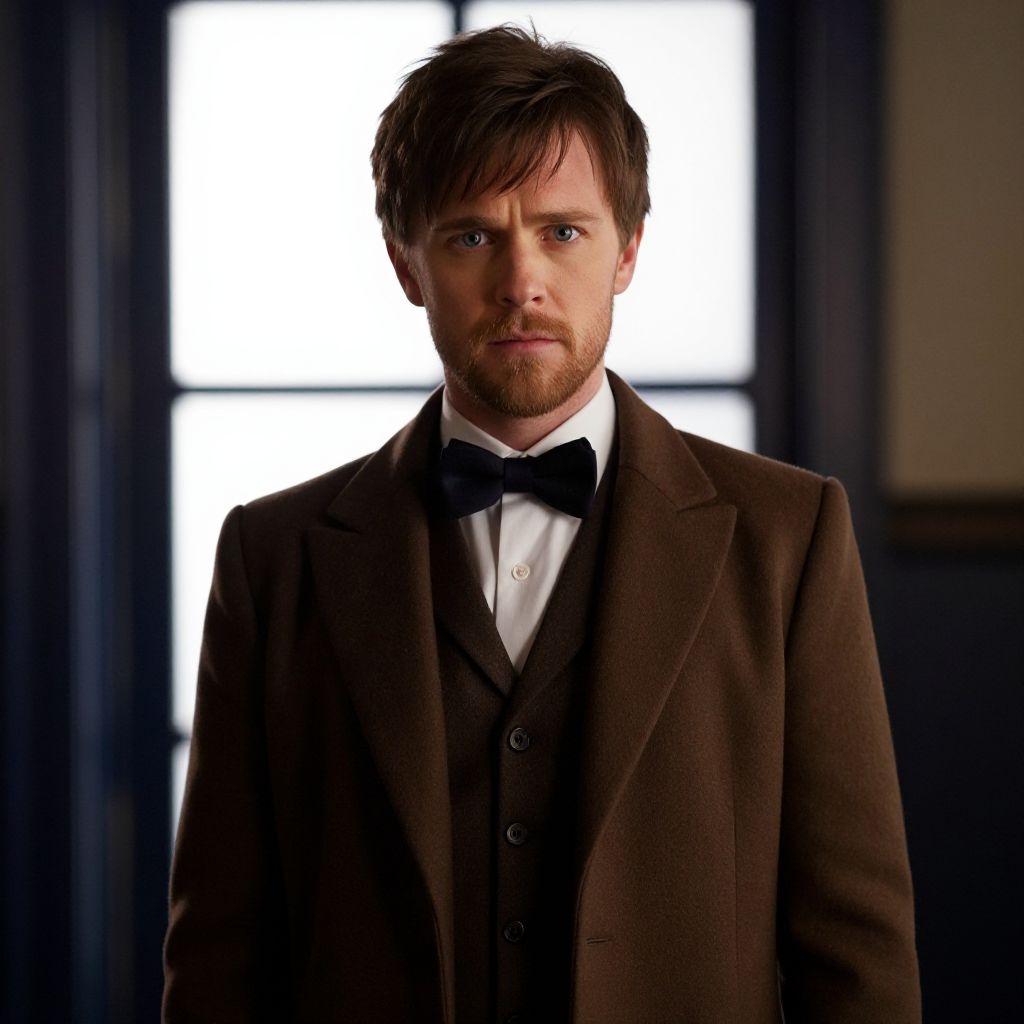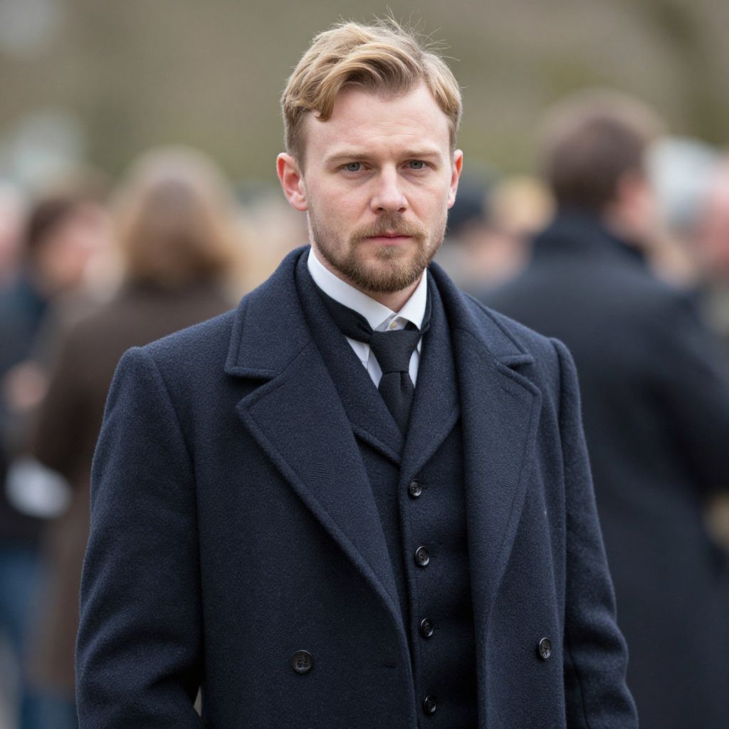 Norman hartnell costume, 1boy, male focus, solo, realistic, blonde hair, facial hair, blurry background, blurry, coat, old, jacket, upper body, looking at viewer, old man, beard