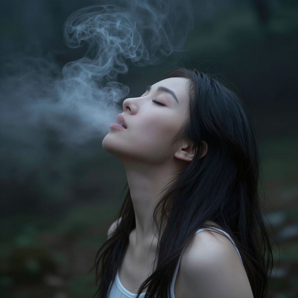 Mist gracefully billows from a woman's lips as she exhales deeply, enveloping her in a serene, ethereal atmosphere amidst a dark, forested backdrop.