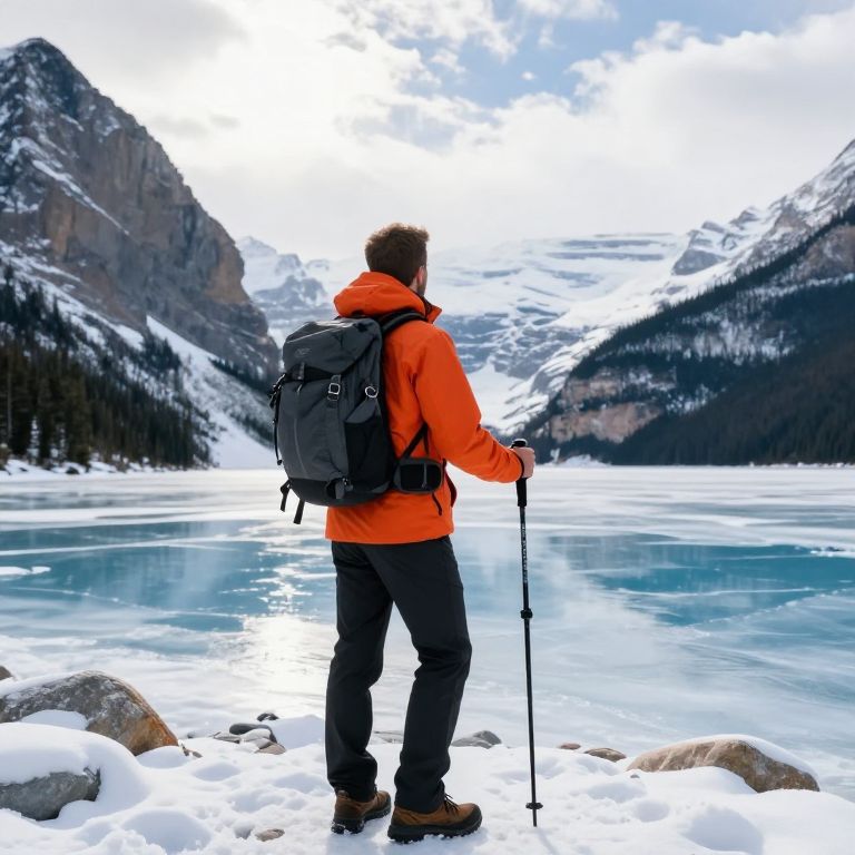 Hiker stands bundled in an orange jacket and black pants, equipped with a backpack and trekking poles, gazing at a serene frozen lake surrounded by majestic snow-covered mountains under a partly cloudy sky.