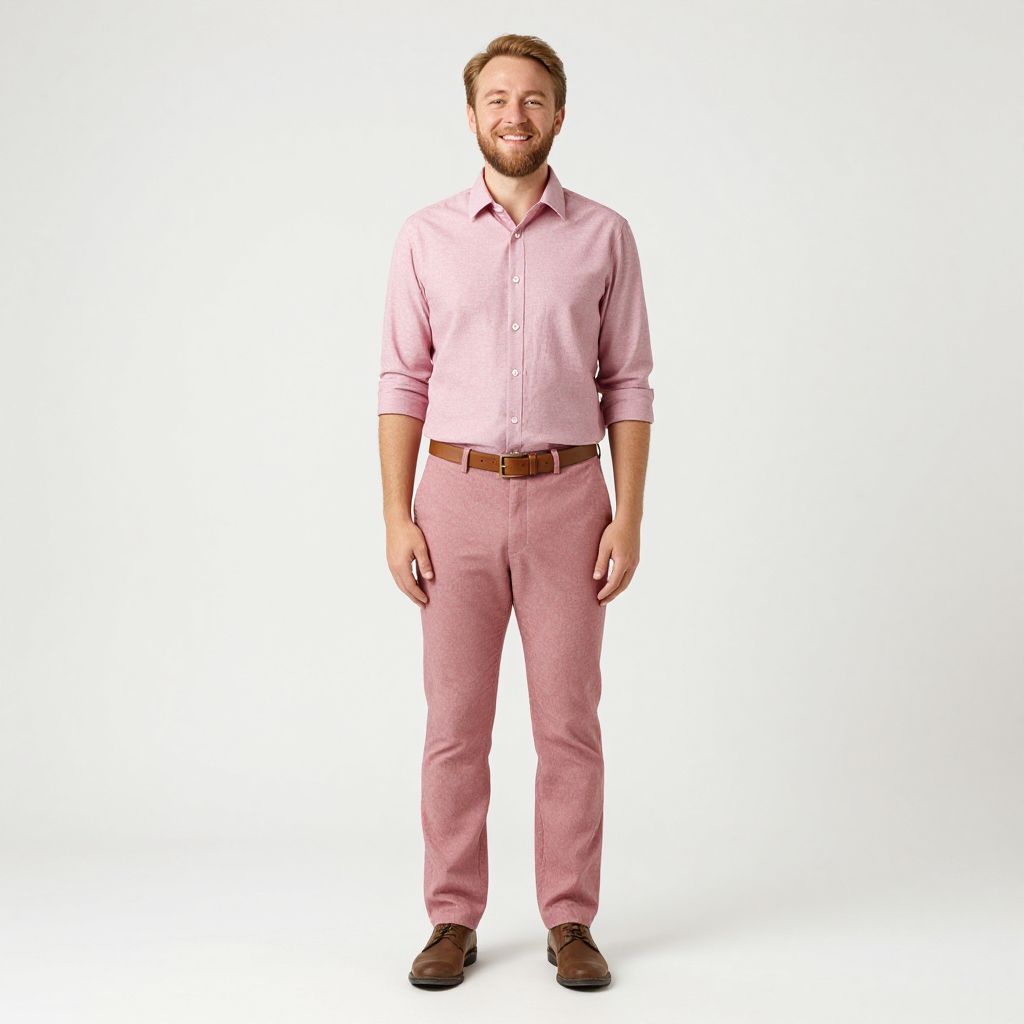 Photograph of a smiling man with light brown hair and a beard, standing against a plain white background. He's wearing a pink, button-up, long-sleeve shirt with the sleeves rolled up, and matching pink trousers, both with a subtle pattern. He's also wearing a brown belt and brown shoes. He has a casual, approachable look and is standing with his hands by his sides.