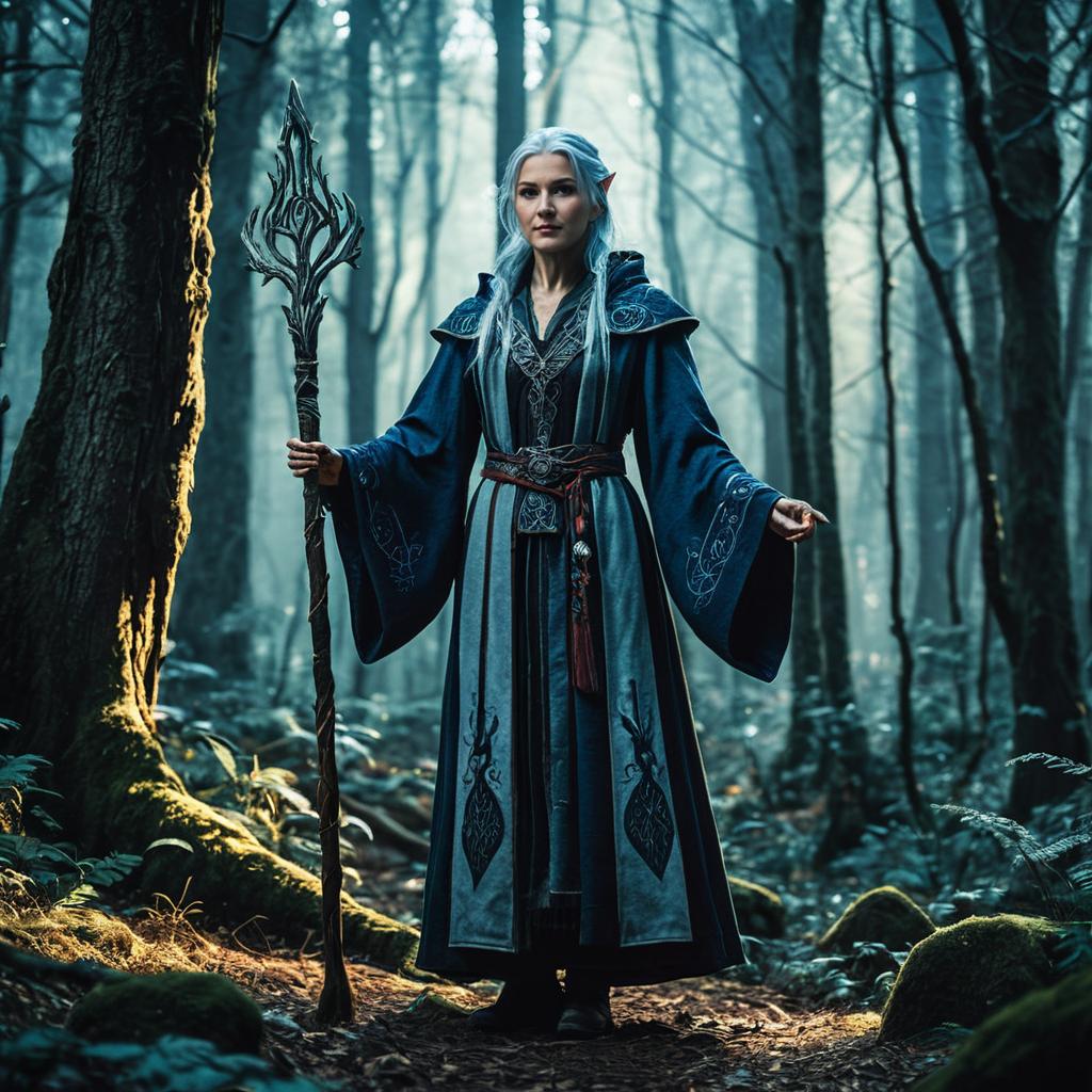 Indoor sticker of a full-body fantasy mage in a enchanted forest, realistic photography with cinematic post-processing, watercolor visuals, moody glow lighting, silver hair, faint aura, vibrant colors, Unreal Engine, color grading, dramatic shadows, 4k