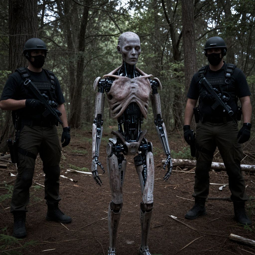 Photograph of two armed soldiers in black gear flanking a metallic, skeleton-like humanoid with exposed ribcage in a dark forest.