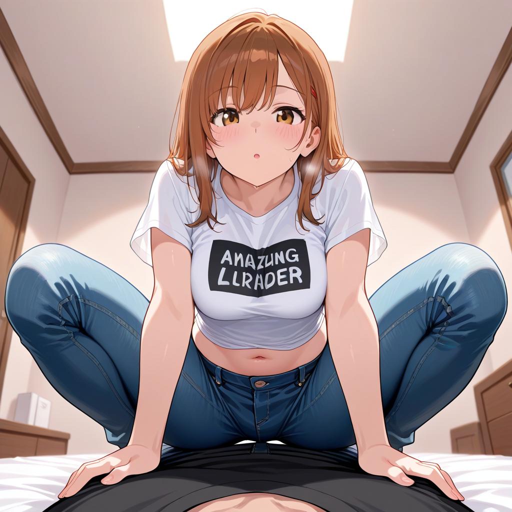 1boy, 1girl, girl on top, hetero, denim jeans, t-shirt, navel, bed, indoors, from below, full body, pov