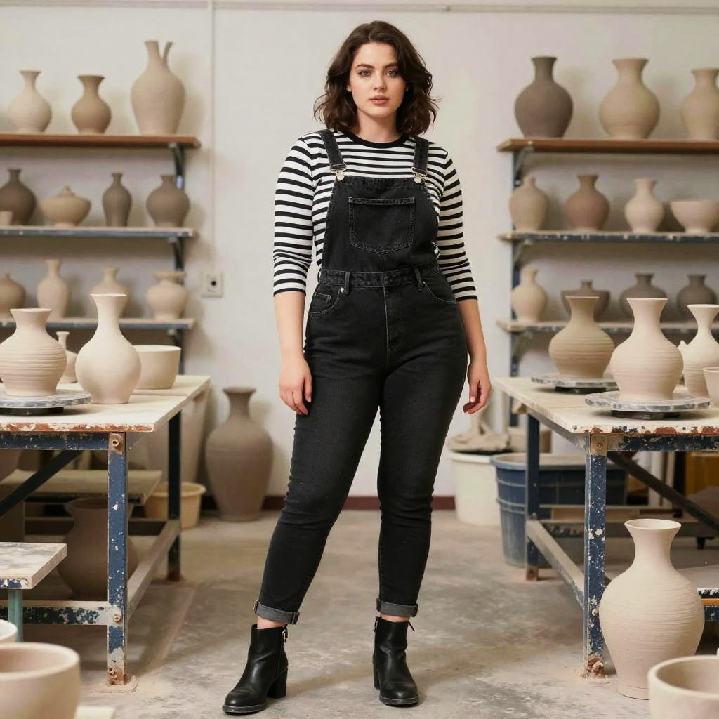 A Curvy woman, in a shogakukan style, wearing a black denim overall with a fitted silhouette and a classic striped long-sleeve T-shirt, paired with black ankle boots, standing in a Pottery studio surrounded by clay sculptures. Sexy. Pretty face and beutiful eyes