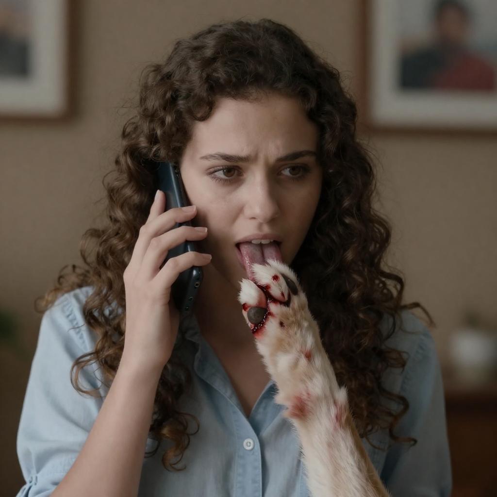 Photograph of a young woman with long, wavy brown hair, wearing a light gray jacket over a white shirt, holding a phone to her ear with her right hand. She has her mouth open in mid-conversation, tongue slightly out. Background is blurred. Her facial expression is intense, focused on the phone call. Blood stains are visible on her shirt and jacket.