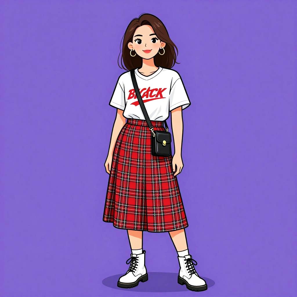 Woman with pretty face and pretty hair. smiling Woman, urban chic, graphic white tee with red logo prints, V-neckline, short sleeves, tucked into a high-waisted red plaid pleated skirt, black leather crossbody phone case with strap, white ankle socks, chunky white lace-up boots, plain studio background. --sref 1467