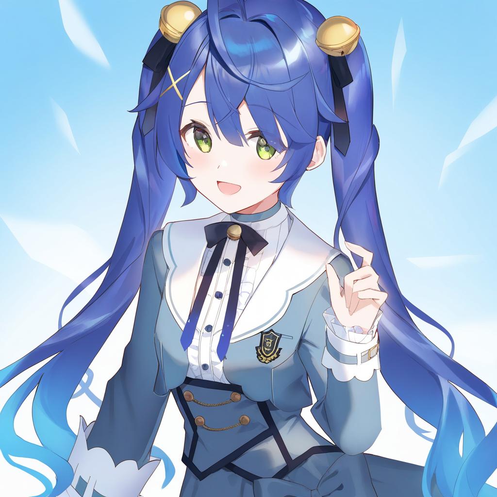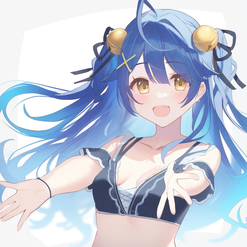 Amamiya kokoro, nijisanji, 1girl, skin fang, yellow eyes, hair between eyes, blue hair, very long hair, long hair, x hair ornament, ahoge, two side up, twintails, hair bell, hair ribbon, small breasts, virtual youtuber, virtual youtuber, jingle bell, by artist weee (raemz), leet