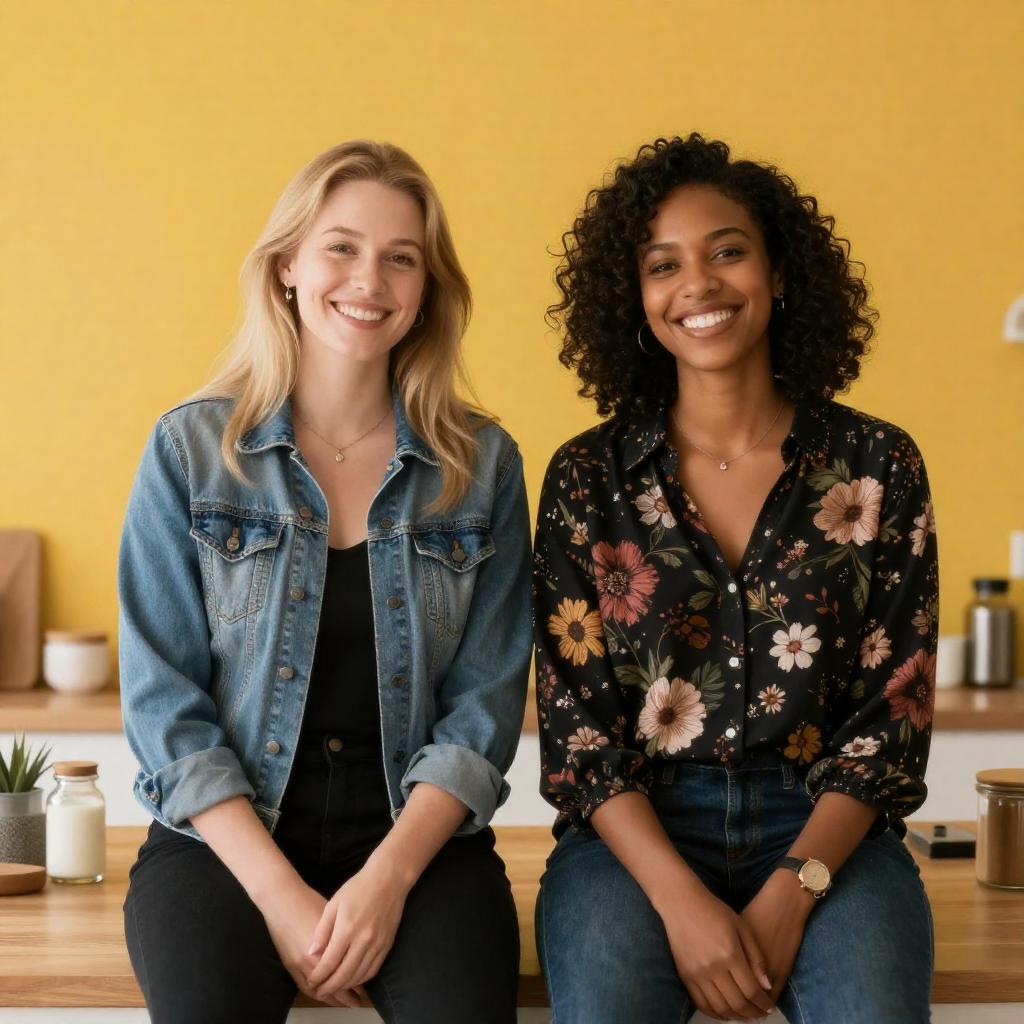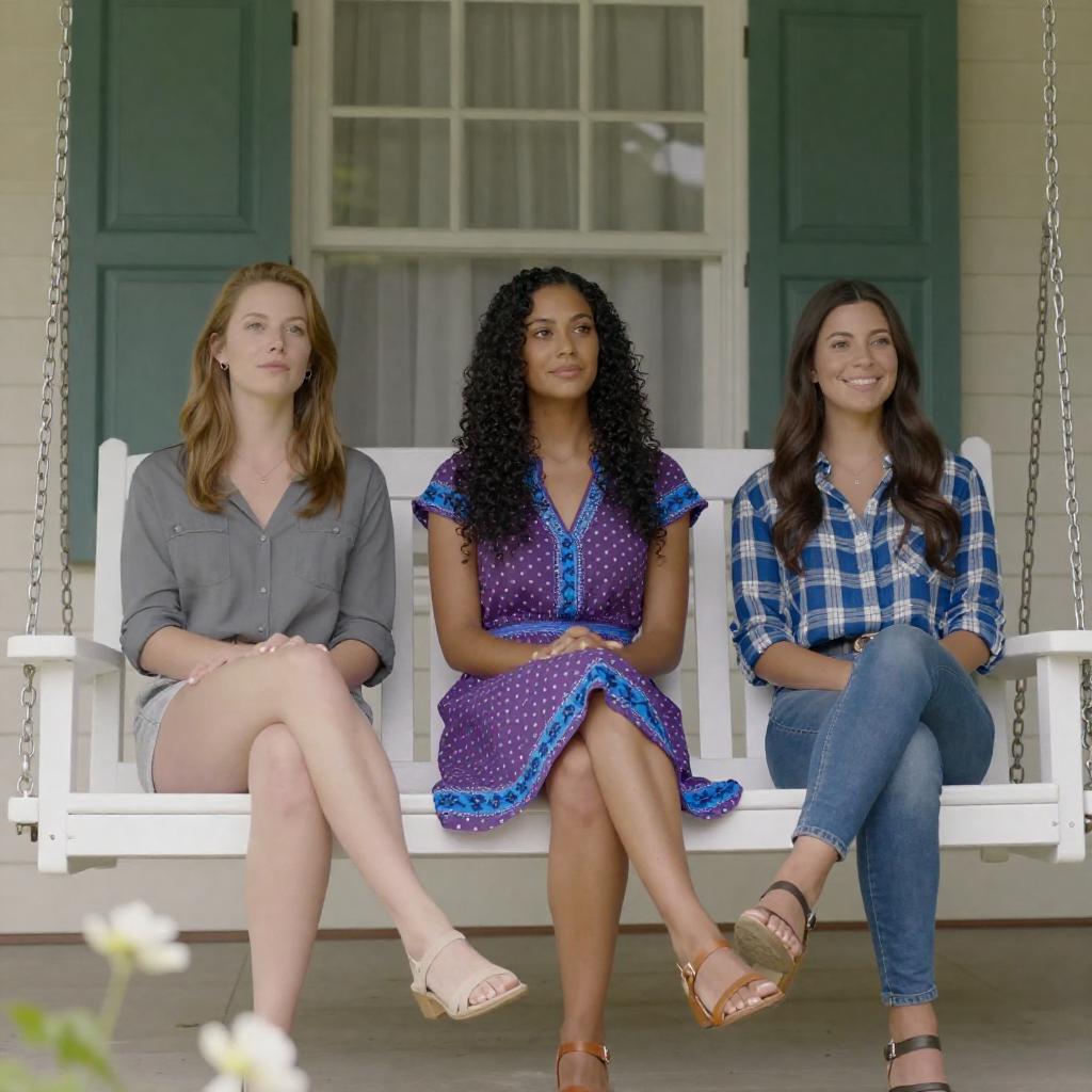 Three women sitting on a white porch swing. Left woman in gray shirt and shorts, middle woman with curly gray hair in pink polka-dot dress, right woman in blue plaid shirt and jeans. All smiling. White wooden house, green-framed windows. Blue patterned cushions. Casual, relaxed.