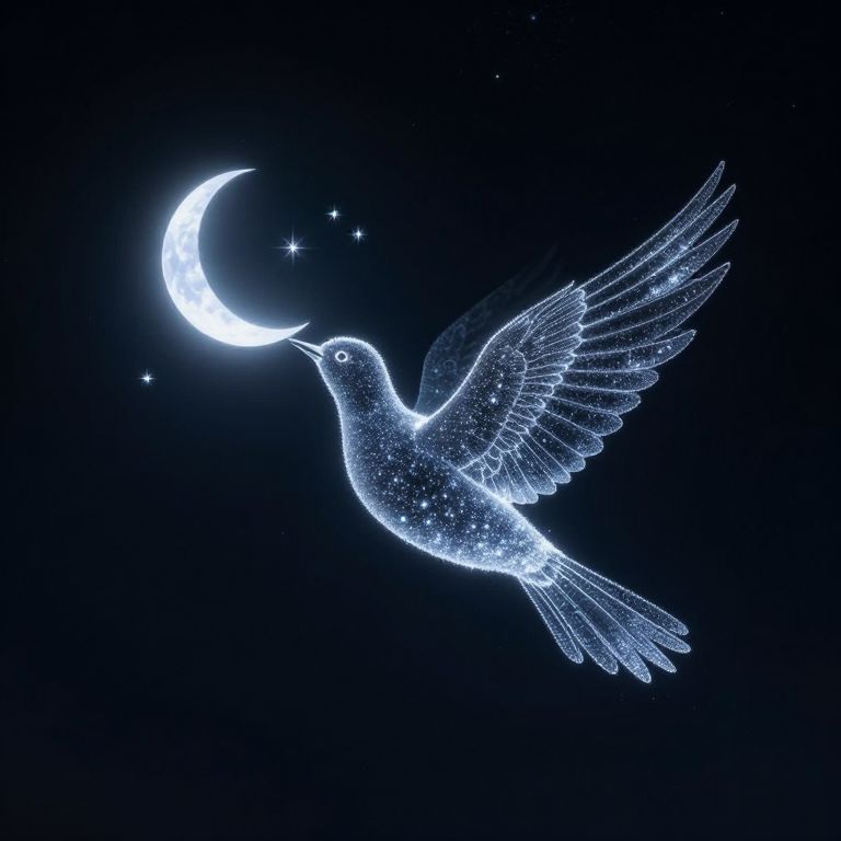 A luminous bird, crafted from stardust and celestial longing, soars gracefully against a dark, star-studded night sky, its wings outstretched as it carries a crescent moon in its beak, surrounded by four bright stars that shimmer like distant beacons.