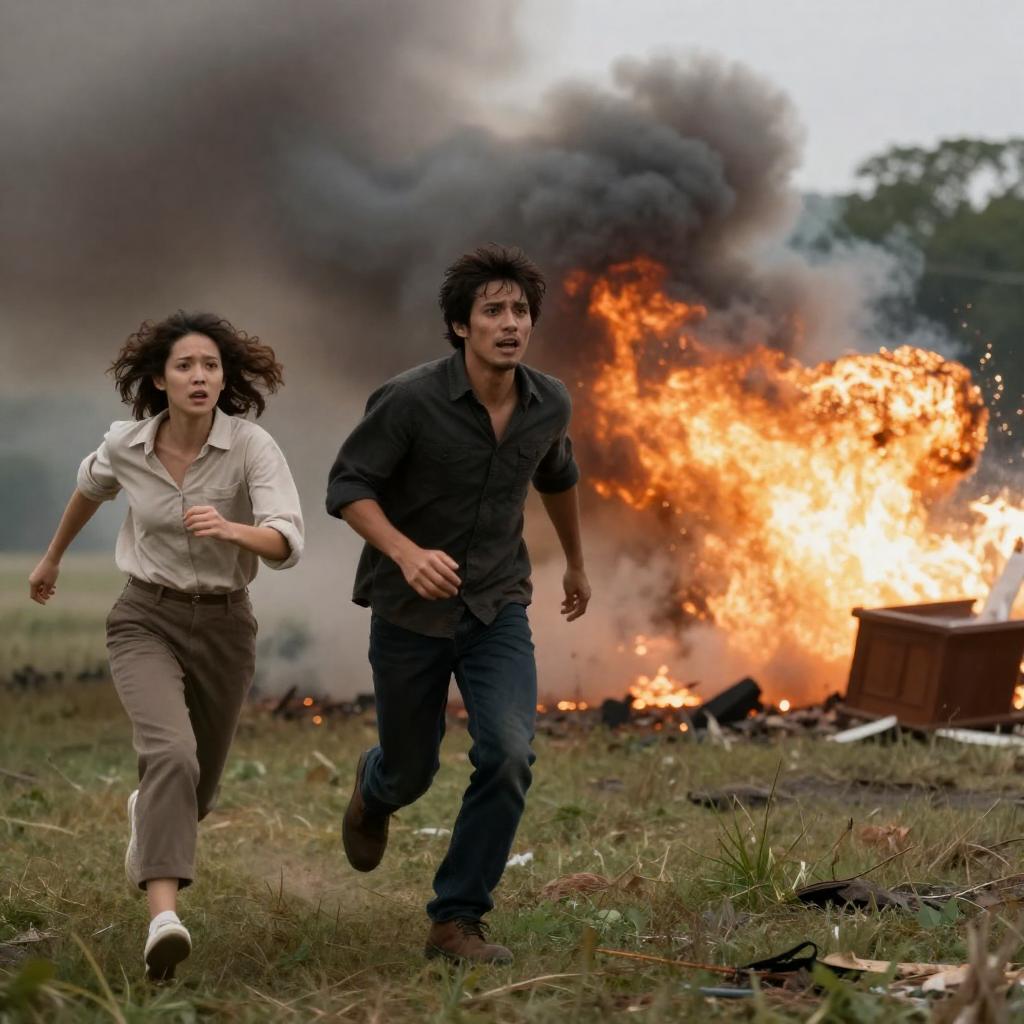Photograph of a man and woman running away from a smoke-filled explosion in a grassy area. Man with dark hair, wearing a dark shirt, has a panicked expression. Woman with curly hair, wearing a light-colored shirt and pants, looks scared. Explosion in the background with dark smoke rising. Several objects, possibly furniture, are partially visible in the explosion's aftermath. Both subjects are positioned to the left, running towards the right.