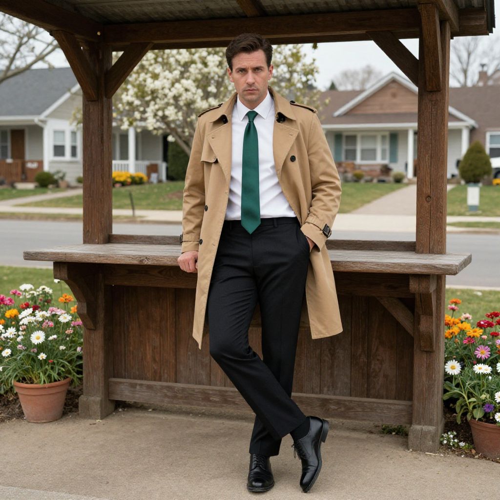 Photograph of a white man with short, dark hair, standing under a wooden gazebo. He wears a tan trench coat over a white shirt and green tie, paired with black trousers and black leather shoes. His left hand rests on the wooden counter, and he gazes directly at the camera with a serious expression. The background shows a suburban neighborhood with white houses, blooming trees, and colorful flower pots. The image has a crisp, bright quality, highlighting the contrast between his dark attire and the light surroundings. The overall style is realistic and slightly formal.
