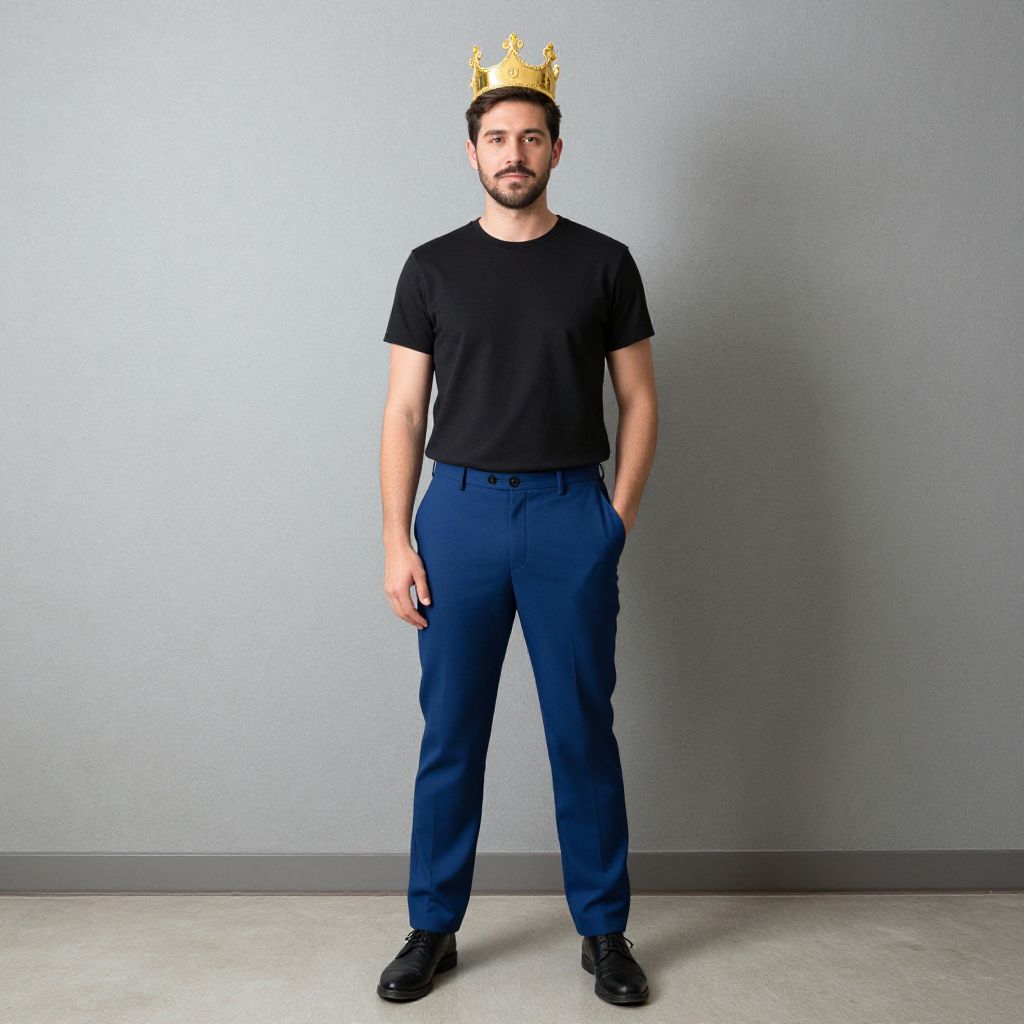 Man birthday outfit costume, 1boy, male focus, solo, crown, hand in pocket, standing, facial hair, looking at viewer, pants, full body, black footwear, blue pants, mustache