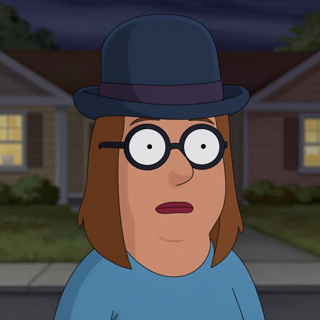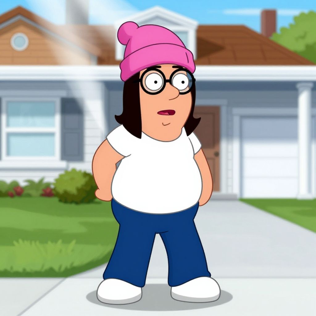 Meg Family Guy costume, close-up of Meg Griffin cosplay focusing on the hat and glasses, digital painting style with realistic fabric texture, moody comic lighting, blurred background echoing a suburban neighborhood, artistic and detailed