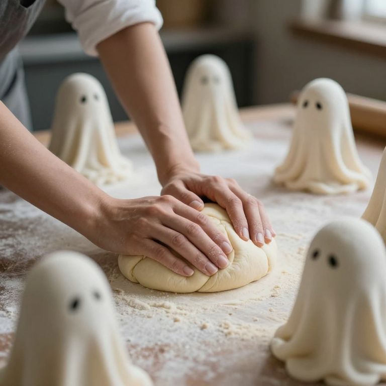 Photograph of a person's hands, light-skinned with slightly visible veins, gently rolling a round, pale dough on a flour-dusted wooden table. Surrounding the dough are six small, white, ghost-shaped cookie cutouts with black dot eyes, evenly spaced. The person is wearing a white-sleeved shirt, and the background is softly blurred, showing a wooden window sill and dark-colored cabinets. The image has a cozy, homemade feel with natural light illuminating the scene.