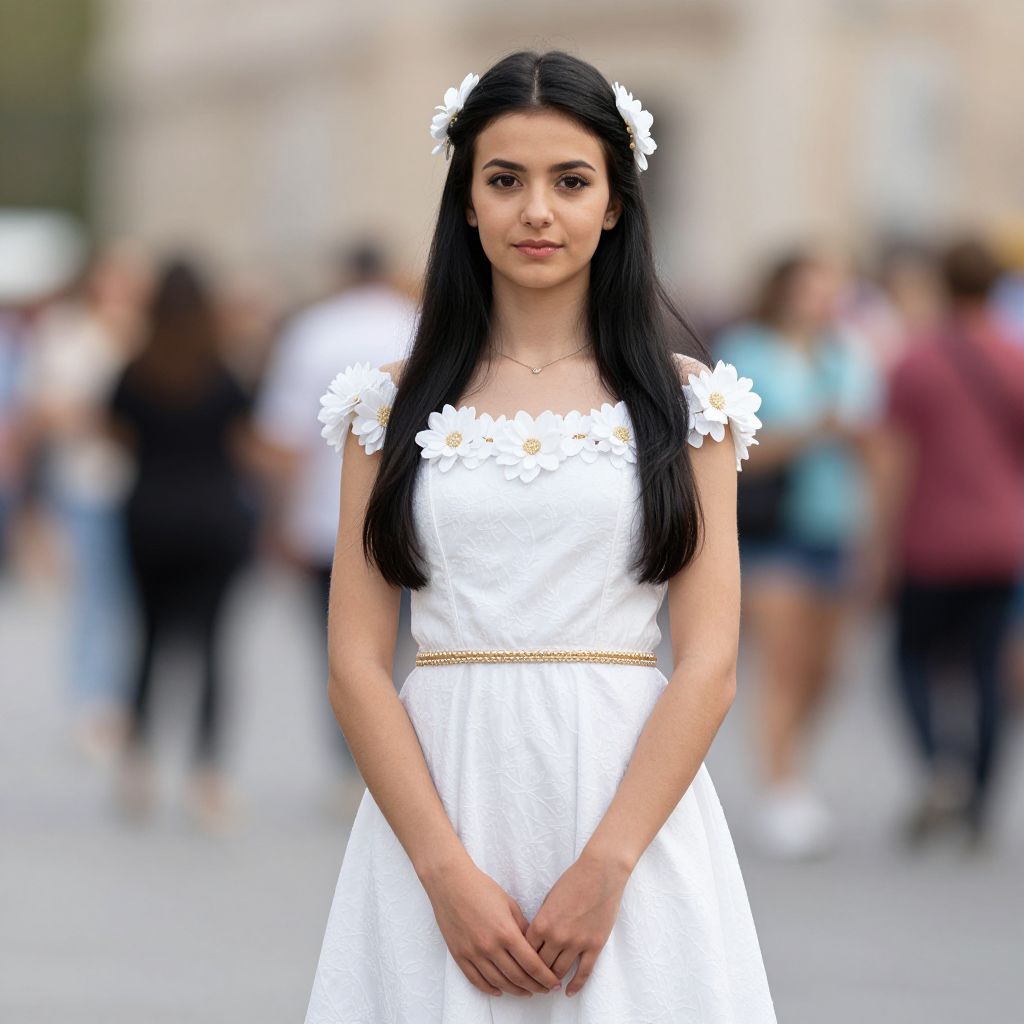 Photograph of a young woman with long, straight black hair, wearing a white, sleeveless, floral-embellished dress with a gold belt. She has a white flower crown and a neutral expression. Her skin is light brown, and she stands in a blurred outdoor urban setting with people in the background, wearing casual clothes. The background is out of focus, highlighting her as the central figure. The overall style is soft and natural, with a slight digital enhancement effect, giving the image a slightly surreal, polished look.