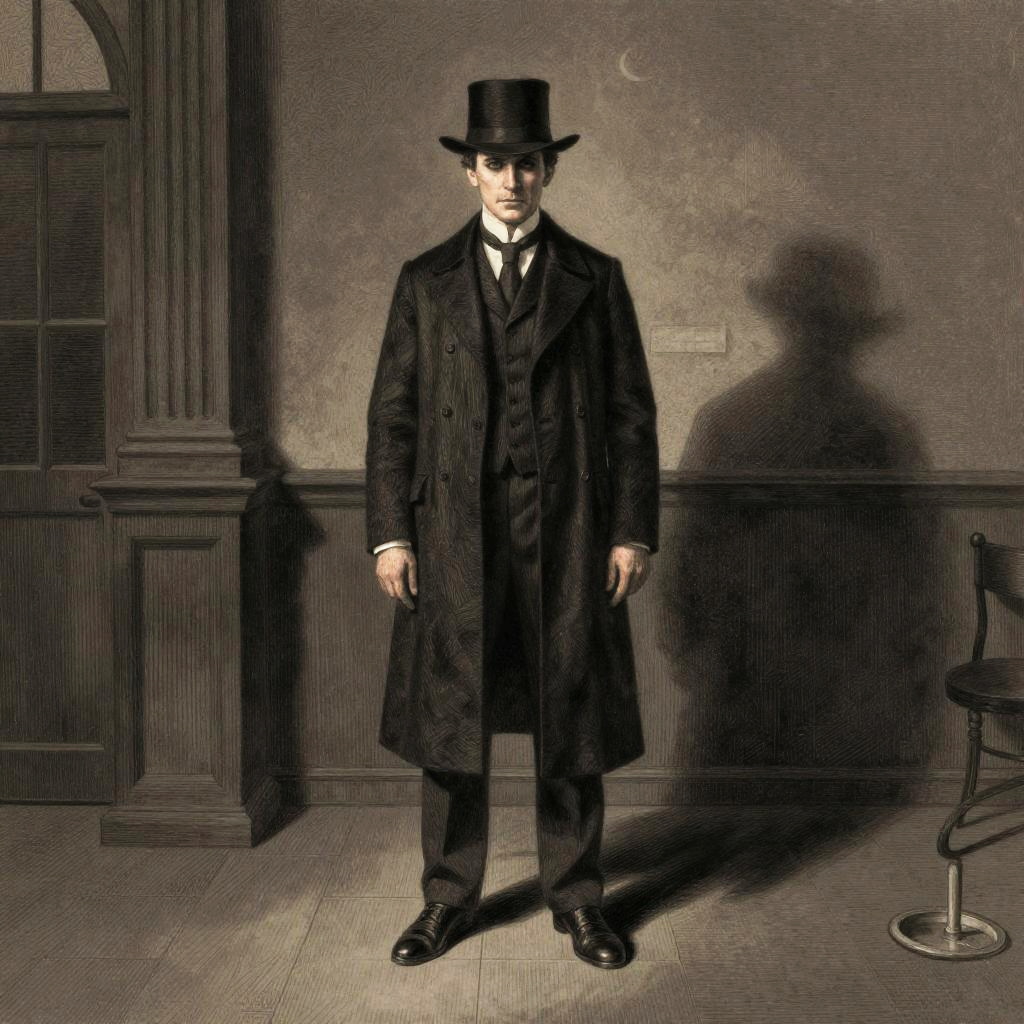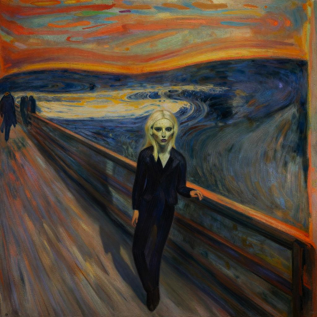 Portrait of a mysterious dancer with a long shadow, inspired by Edvard Munch, James Jean, enigmatic atmosphere, realistic and surreal details, high contrast, moody lighting