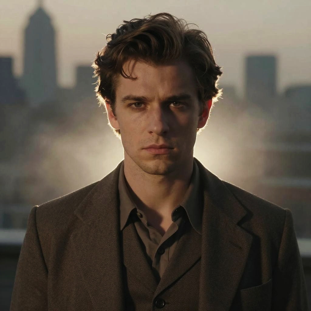 Portrait of lг©on with detailed hair texture and intense eyes, surrounded by a softly glowing fog, muted earth tones palette, stylish vintage outfit, subtle cinematic chiaroscuro lighting, background hints of a metropolitan skyline at dusk.