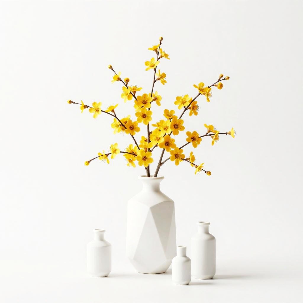 A crisp digital stippling featuring an angular white porcelain bottle holding a spray of tiny golden yellow blossoms, on a seamless white background with three small empty white bottles nearby; high contrast, bold accent colors, thin clean lines, balanced composition, generous negative space, soft studio lighting, modern minimalist aesthetic, crisp edges, no text, no watermark