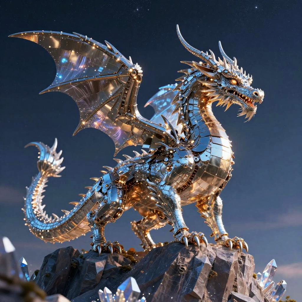 Majestic AI art dragon made of shimmering metallic plates and glowing fiber optic veins, perched atop a crystalline mountain peak under a starry sky, blending fantasy and advanced technology in a vibrant, surreal atmosphere.