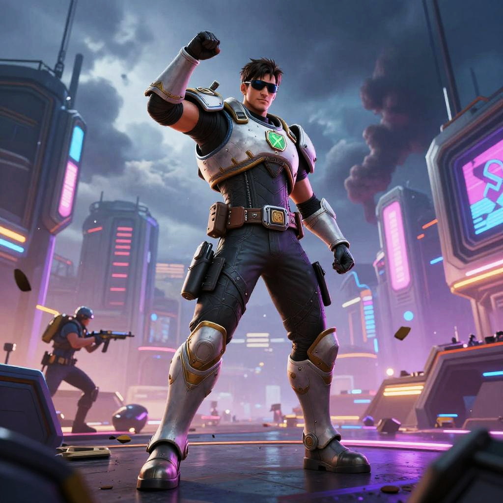 Action-packed scene featuring Ramirez Fortnite character aged to show veteran status, surrounded by futuristic weaponry and tech, intense color palette of blues and oranges, mid-action pose with explosive background, concept art style with high detail.